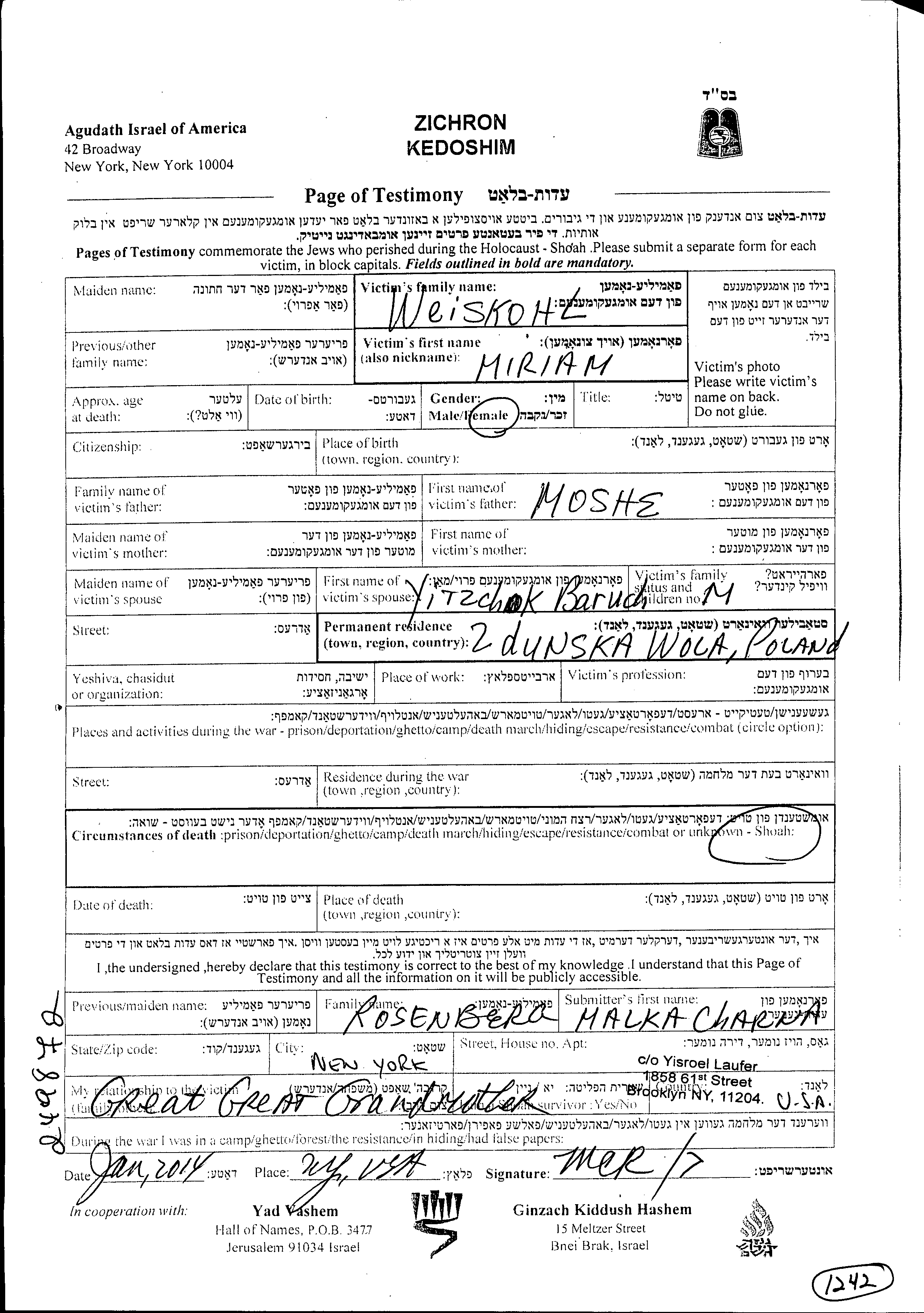 Miriam Weiskohl was born to Moshe. She was married to Yitzchok Baruch. Prior to WWII she lived in Zdunska Wola, Poland. Miriam was murdered in the Shoah. Place of death: unstated place.