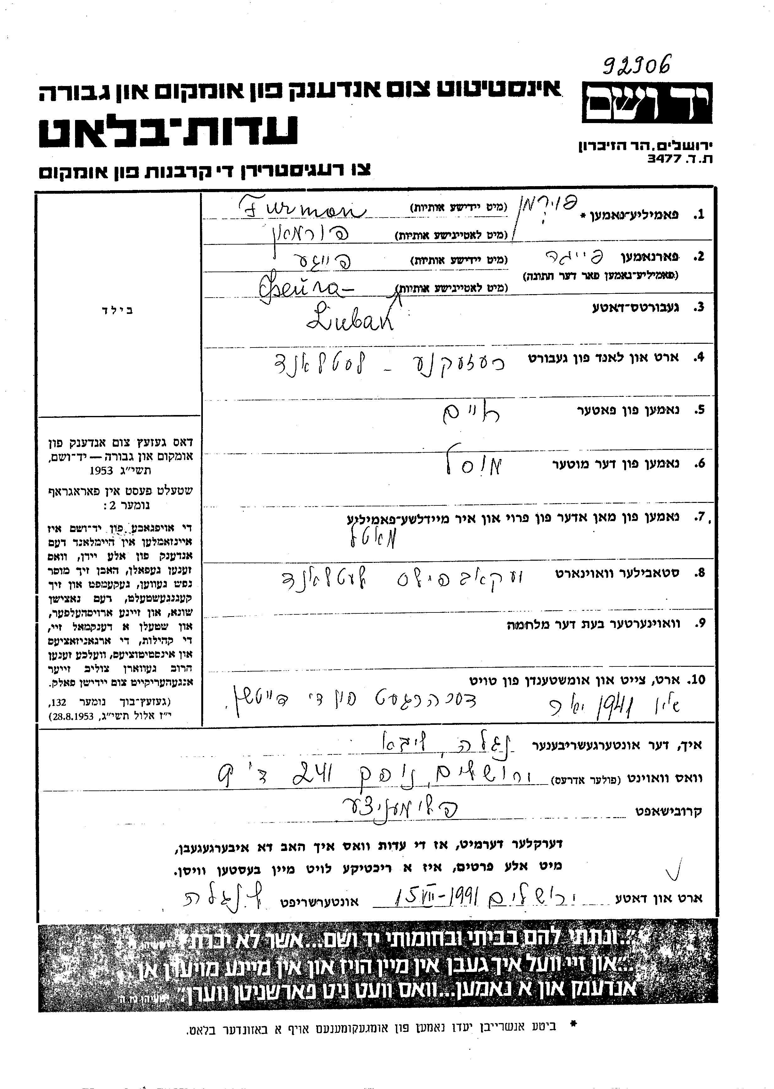 Feiga Furman nee Luban was born in Rēzekne, Latvia to Khaim and Musl Miosel. She was married to Motel. Prior to WWII she lived in Jekabpils, Latvia. During the war she was in Jekabpils, Latvia. Feiga was murdered in the Shoah. Place of death: Latvia, 1941.