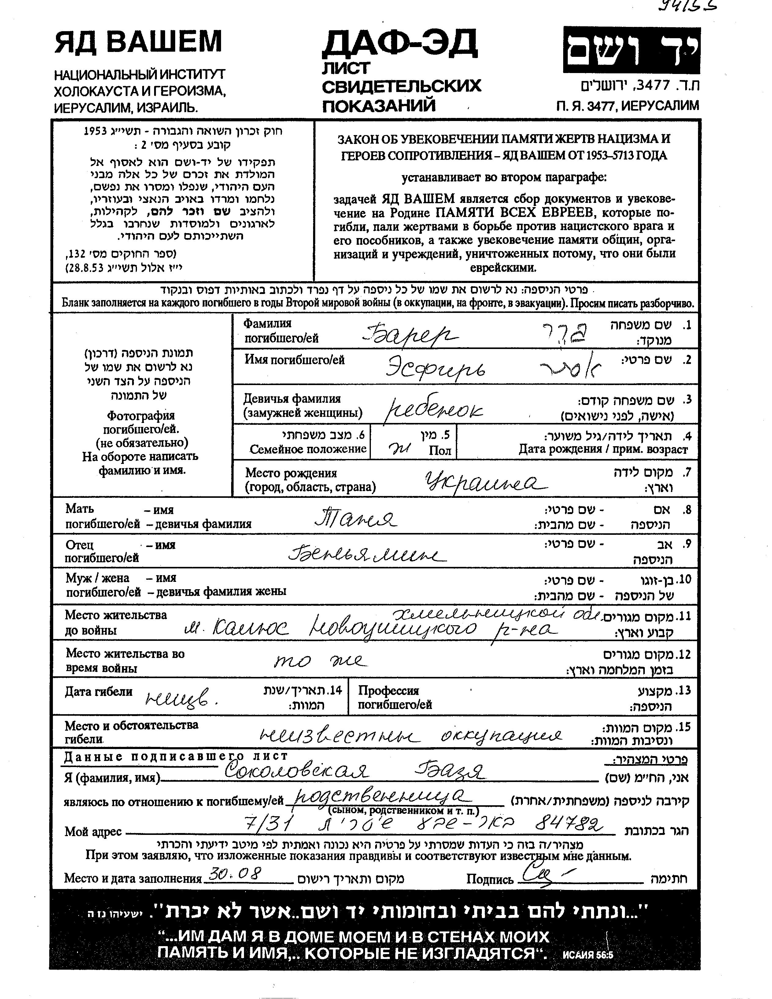 Esfir Barer was born in Ukraine (USSR) to Beniamin and Tania. She was child. Prior to WWII she lived in Kalyus, Ukraine (USSR). During the war she was in Kalyus, Ukraine (USSR). Esfir was murdered in the Shoah.