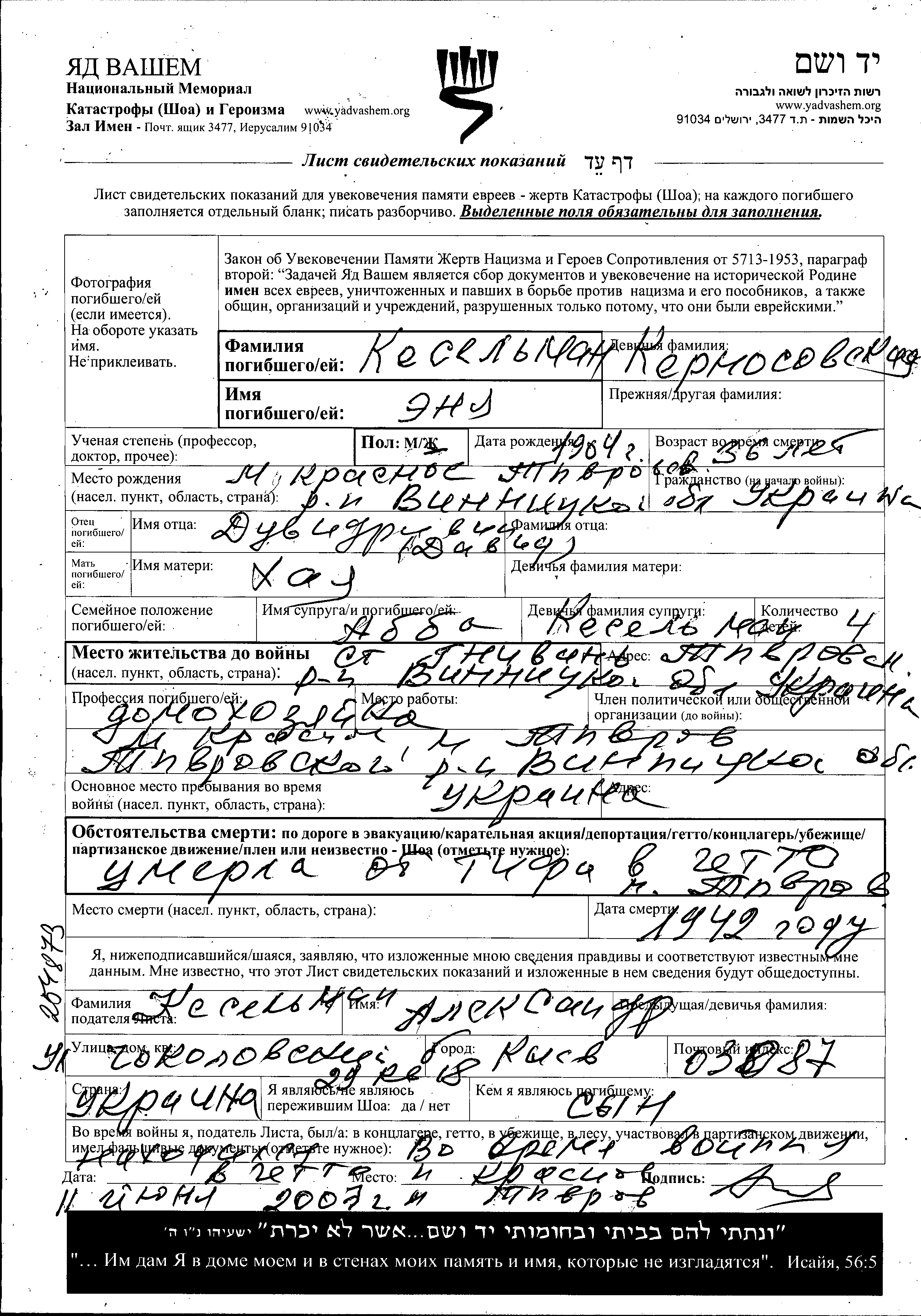 Enya Keselman nee Kernosovskaya was born in Krasnoye, Ukraine (USSR), 1904 to Duvid and Khaya. She was a housewife and married to Abba. Prior to WWII she lived in Gnivan, Ukraine (USSR). During the war she was in Krasnoye, Ukraine (USSR). Enya was murdered in the Shoah. Place of death: Tyvrov, Ukraine (USSR), 1942.