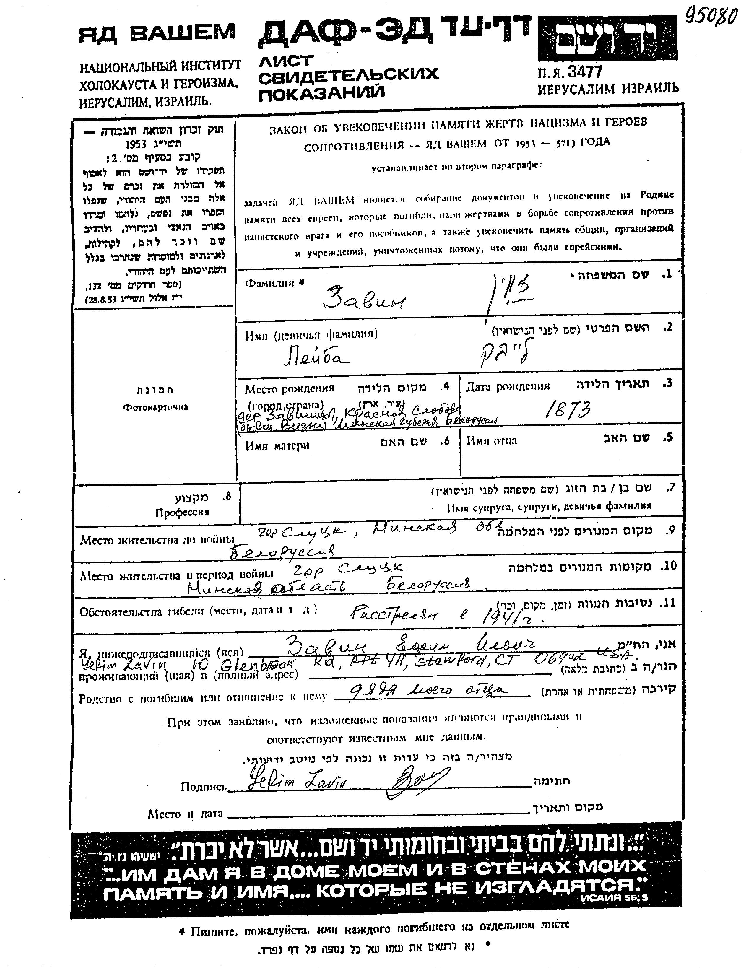 Zavin Leiba 1873 Slutsk, Belorussia (USSR) Page of Testimony