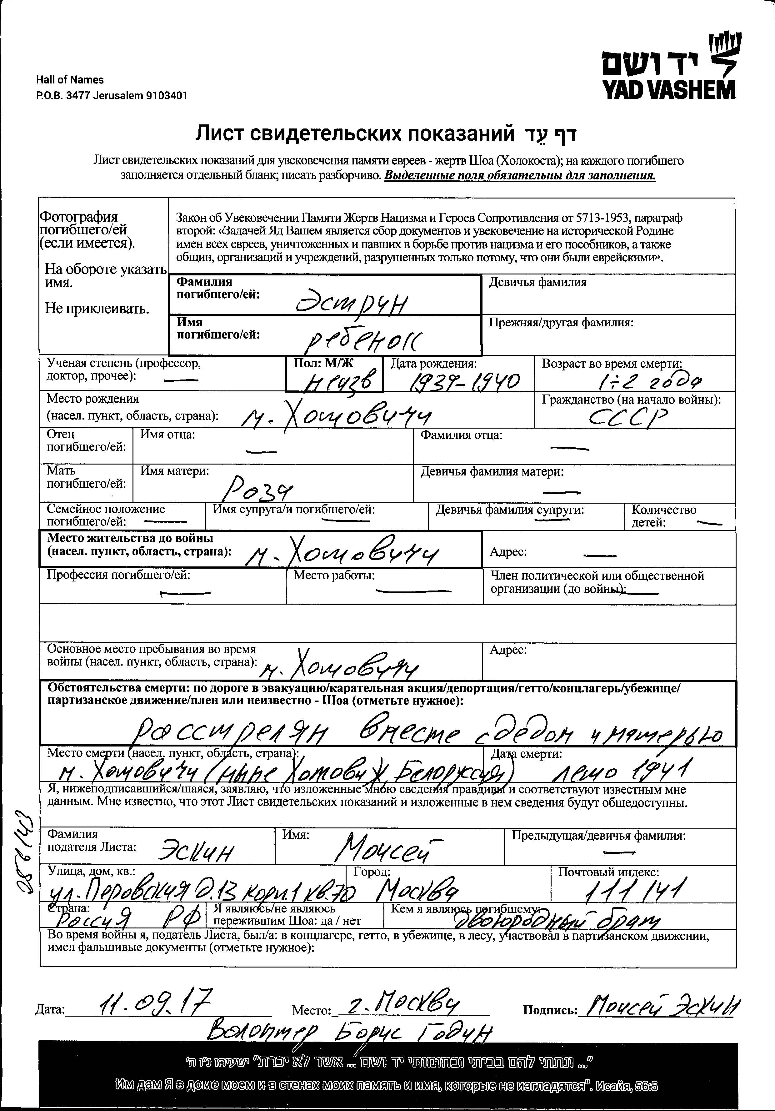 First name unknown Estrin was born in Khotovichi, Belorussia (USSR), 1940 to Roza. Was child. Prior to WWII lived in Khotovichi, Belorussia (USSR). During the war was in Khotovichi, Belorussia (USSR). Was murdered in the Shoah. Place of death: Khotovichi, Belorussia (USSR), 07/1941.