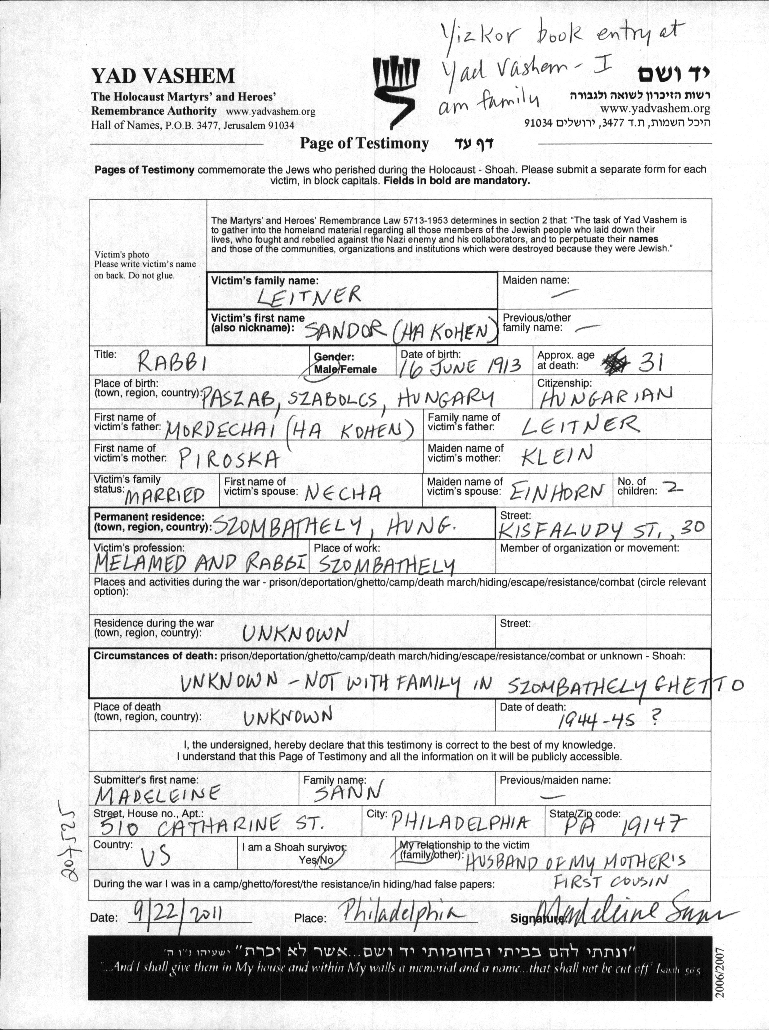 Leitner Sandor 1913 Szombathely, Hungary Page of Testimony