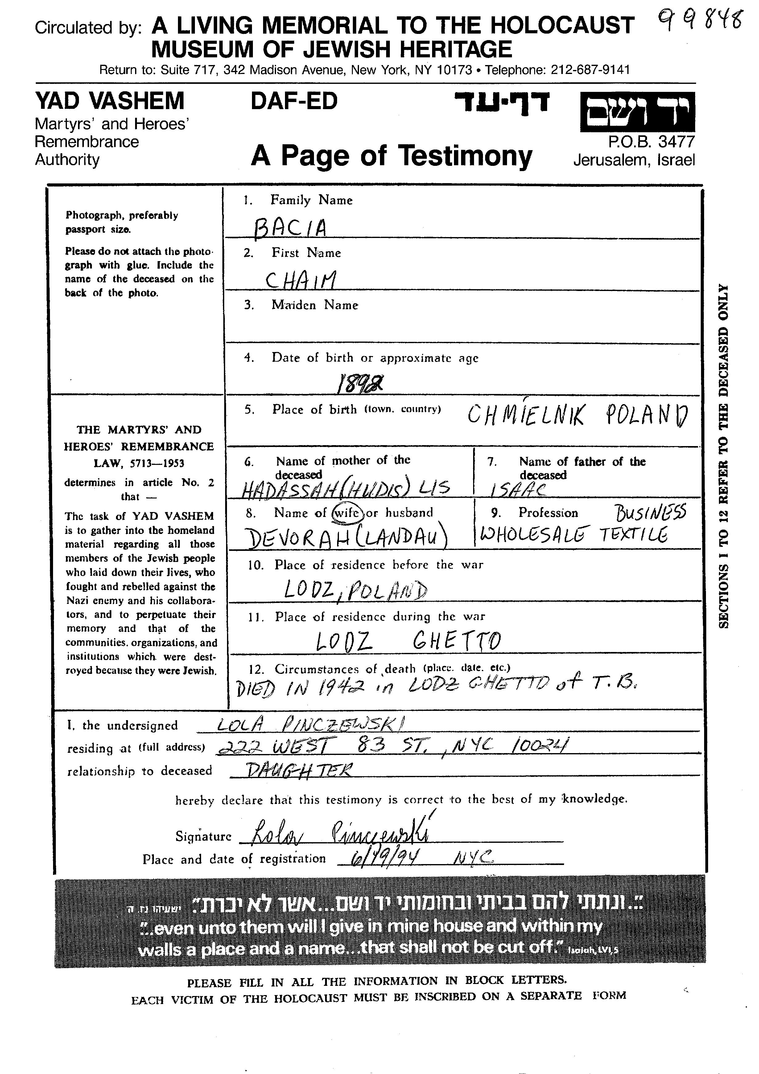Chaim Bacia was born in Chmielnik, Poland, 1892 to Isaac and Hadassah Lis nee Hudis Hodis. He was a businessman and married to Devorah. Prior to WWII he lived in Lodz, Poland. During the war he was in Lodz, Poland. Chaim was murdered in the Shoah. Place of death: Lodz, Poland, 1942.