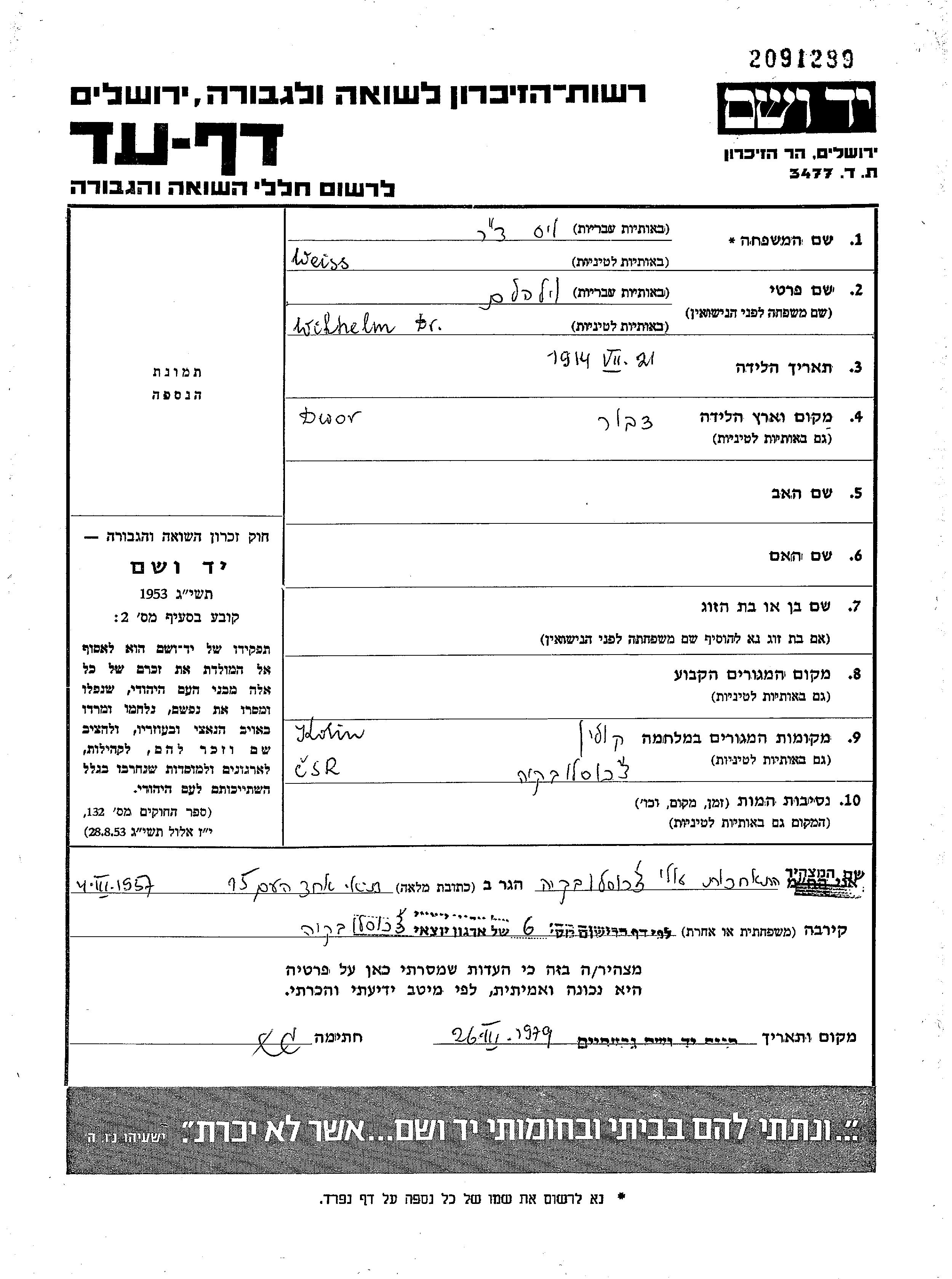 Weiss Wilhelm 1914 unstated place, Page of Testimony
