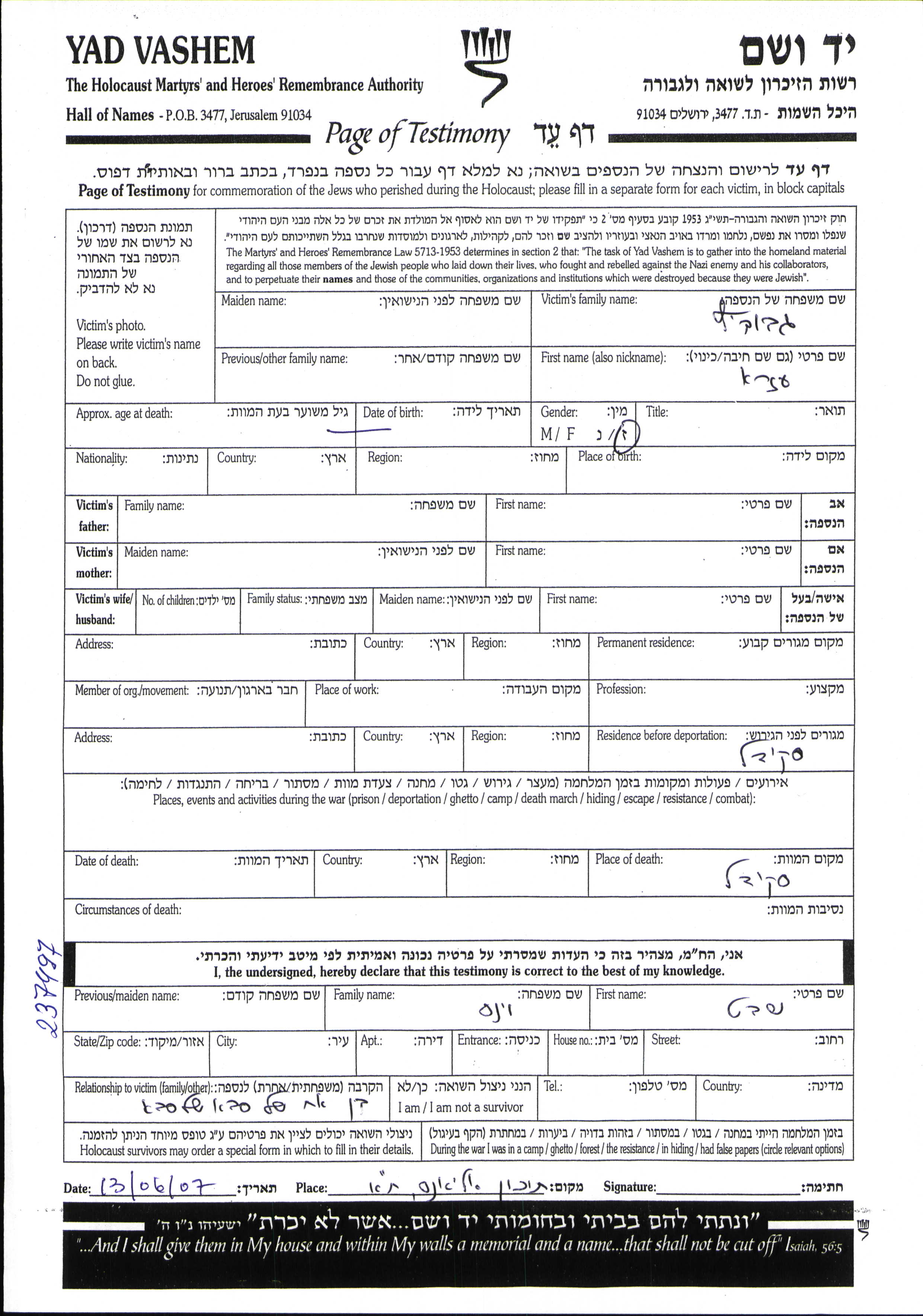 Yad Vashem - Pages of Testimony Names Memorial Collection