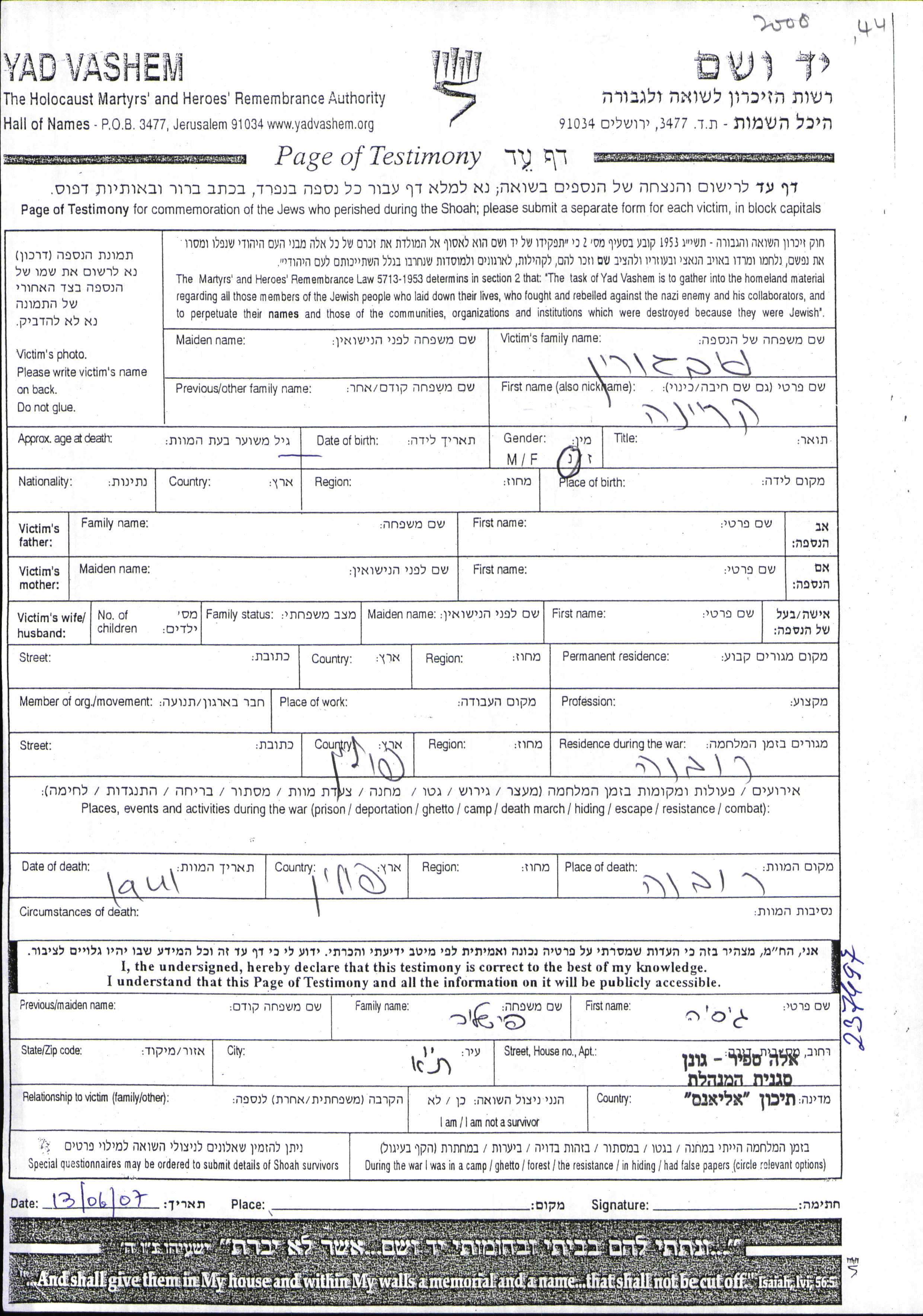 Yad Vashem - Pages of Testimony Names Memorial Collection
