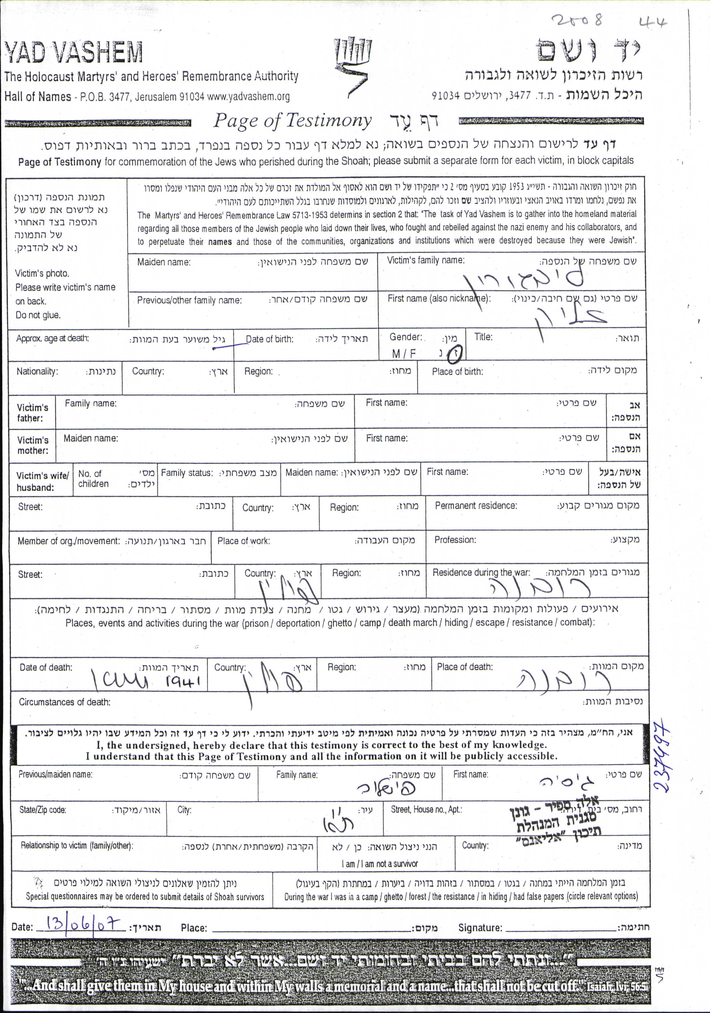 Yad Vashem - Pages of Testimony Names Memorial Collection