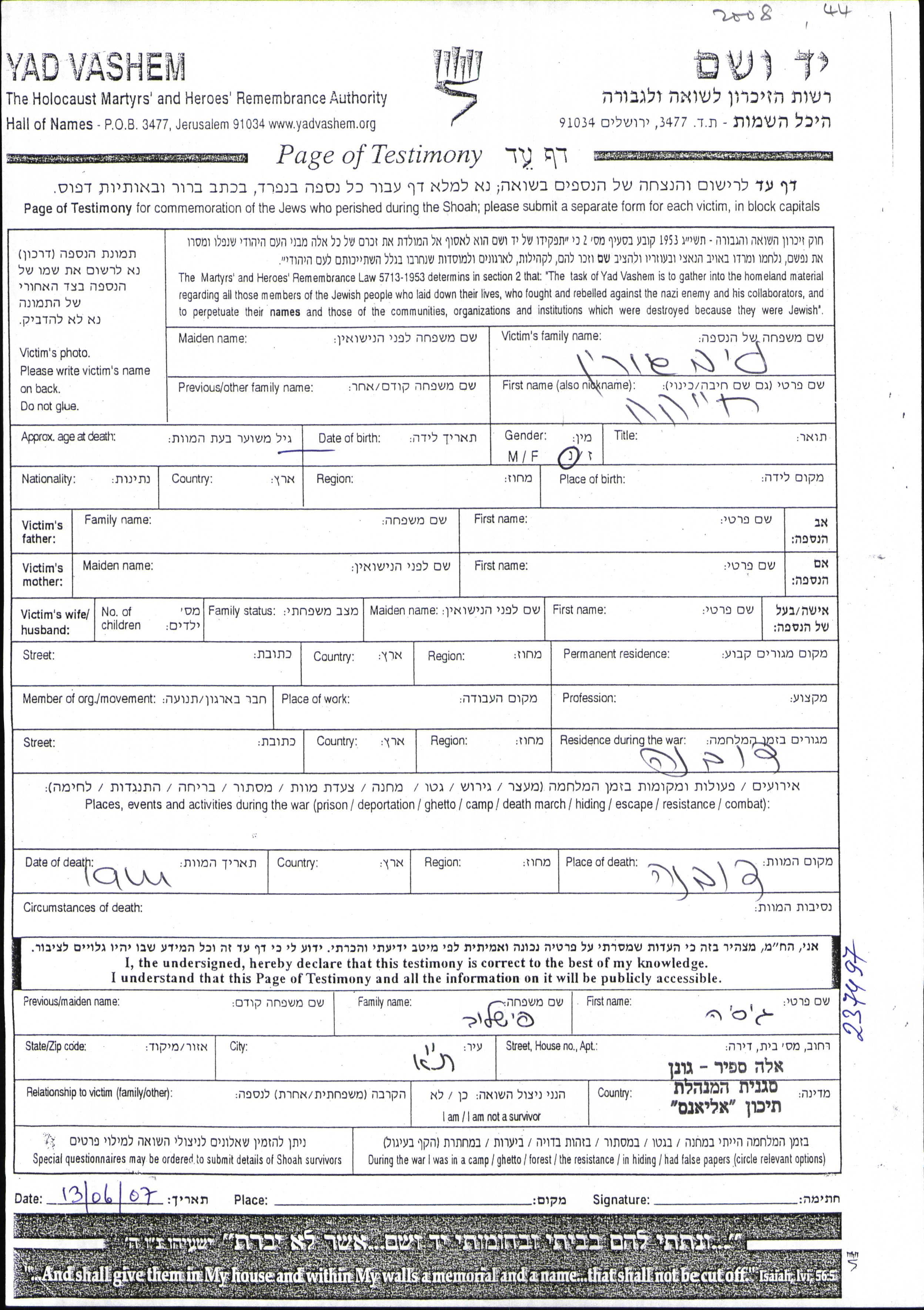 Yad Vashem - Pages of Testimony Names Memorial Collection