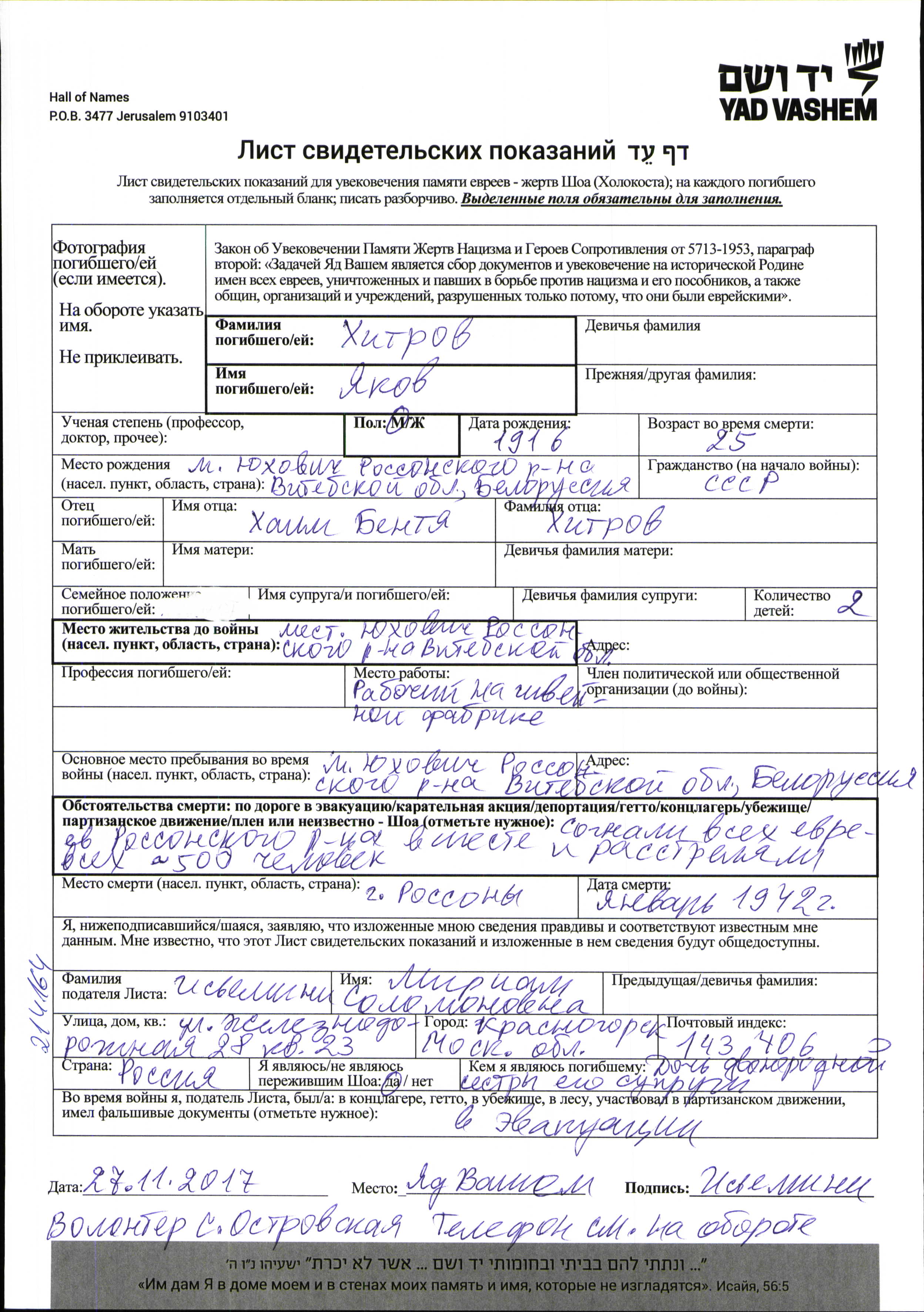 Yakov Khitrov was born in Yukhovichi, Belorussia (USSR), 1916 to Khaim Bentya. He was a worker. Prior to WWII he lived in Yukhovichi, Belorussia (USSR). During the war he was in Yukhovichi, Belorussia (USSR). Yakov was murdered in the Shoah. Place of death: Rossony, Belorussia (USSR), 01/1942.