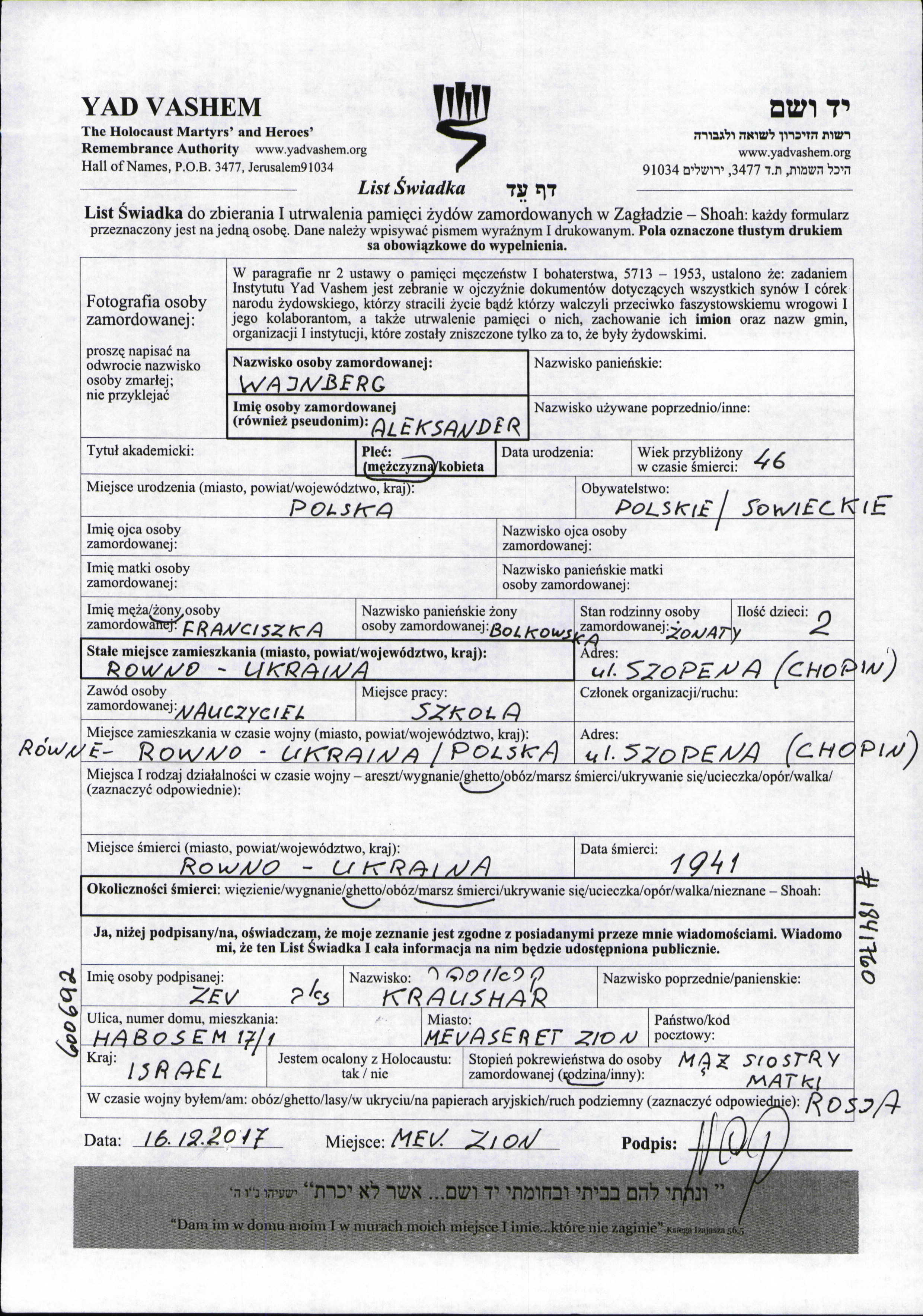 Wajnberg Aleksander Rowno, Poland Page of Testimony