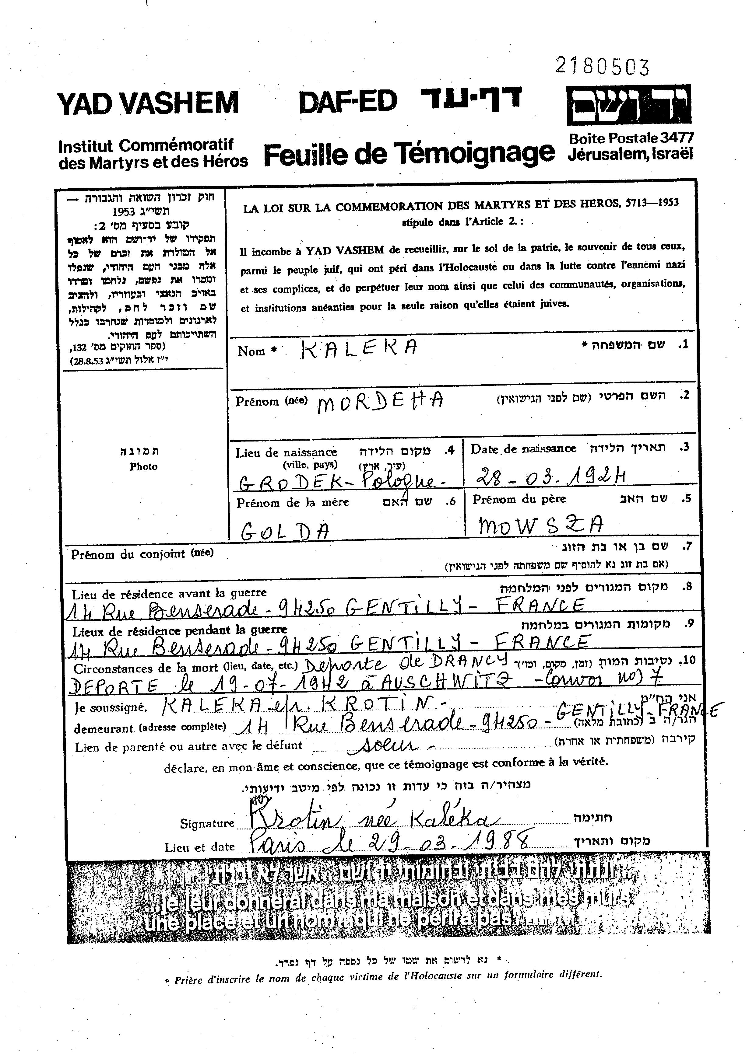 | Kaleka | Mordcha | 1924 | Gentilly, France | Page of Testimony |