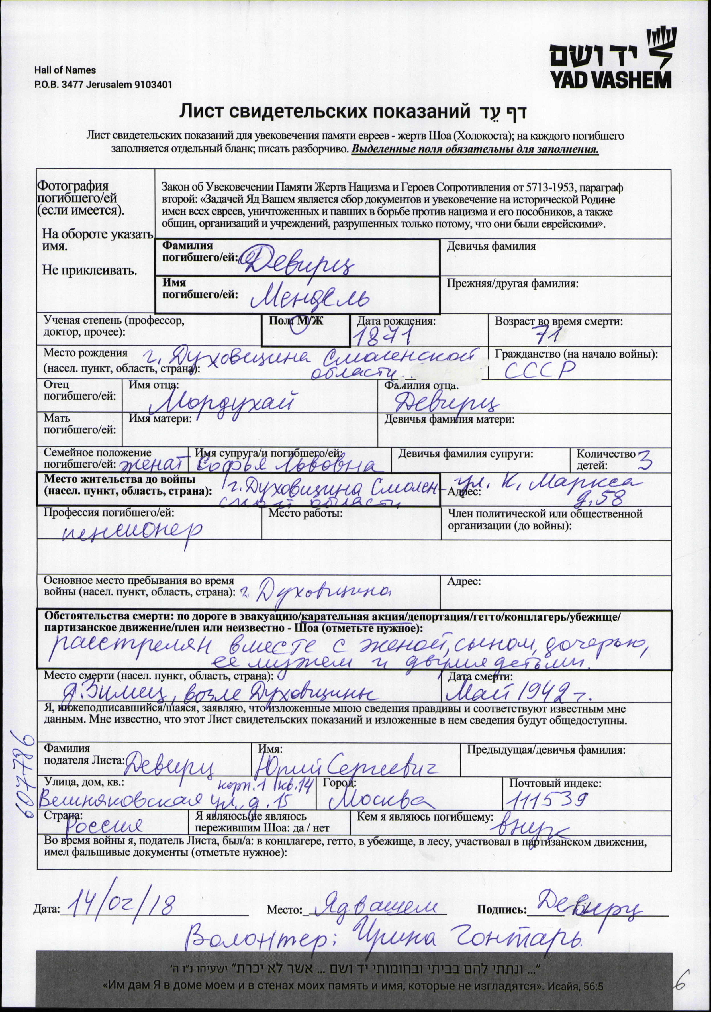 Mendel Devirtz was born in Dukhovshchina, Russia (USSR), 1871 to Mordukhay. He was married to Sofiya. Prior to WWII he lived in Dukhovshchina, Russia (USSR). During the war he was in Dukhovshchina, Russia (USSR).