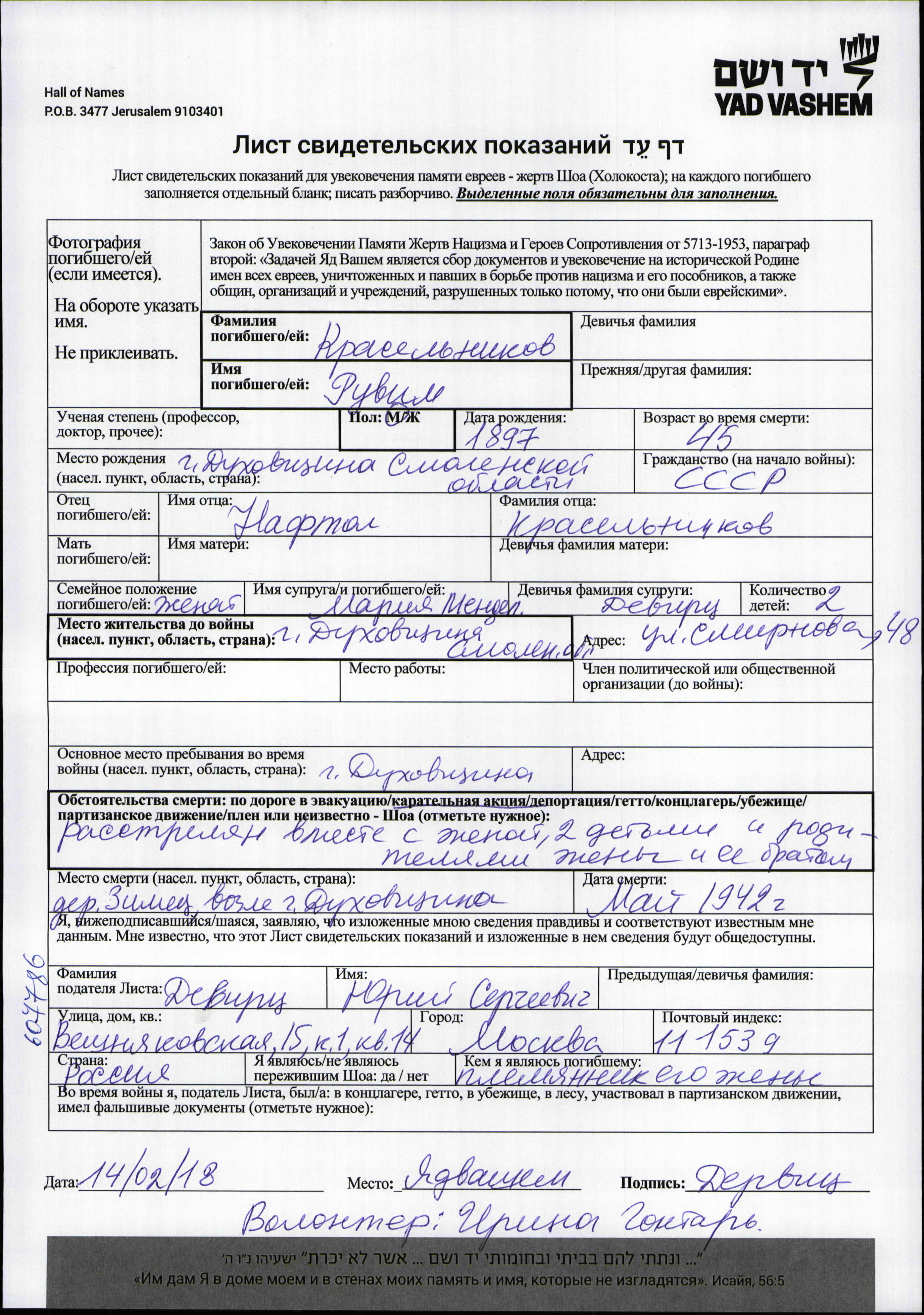 Kraselnikov Ruvim 1897 Dukhovshchina, Russia (USSR) Page of Testimony