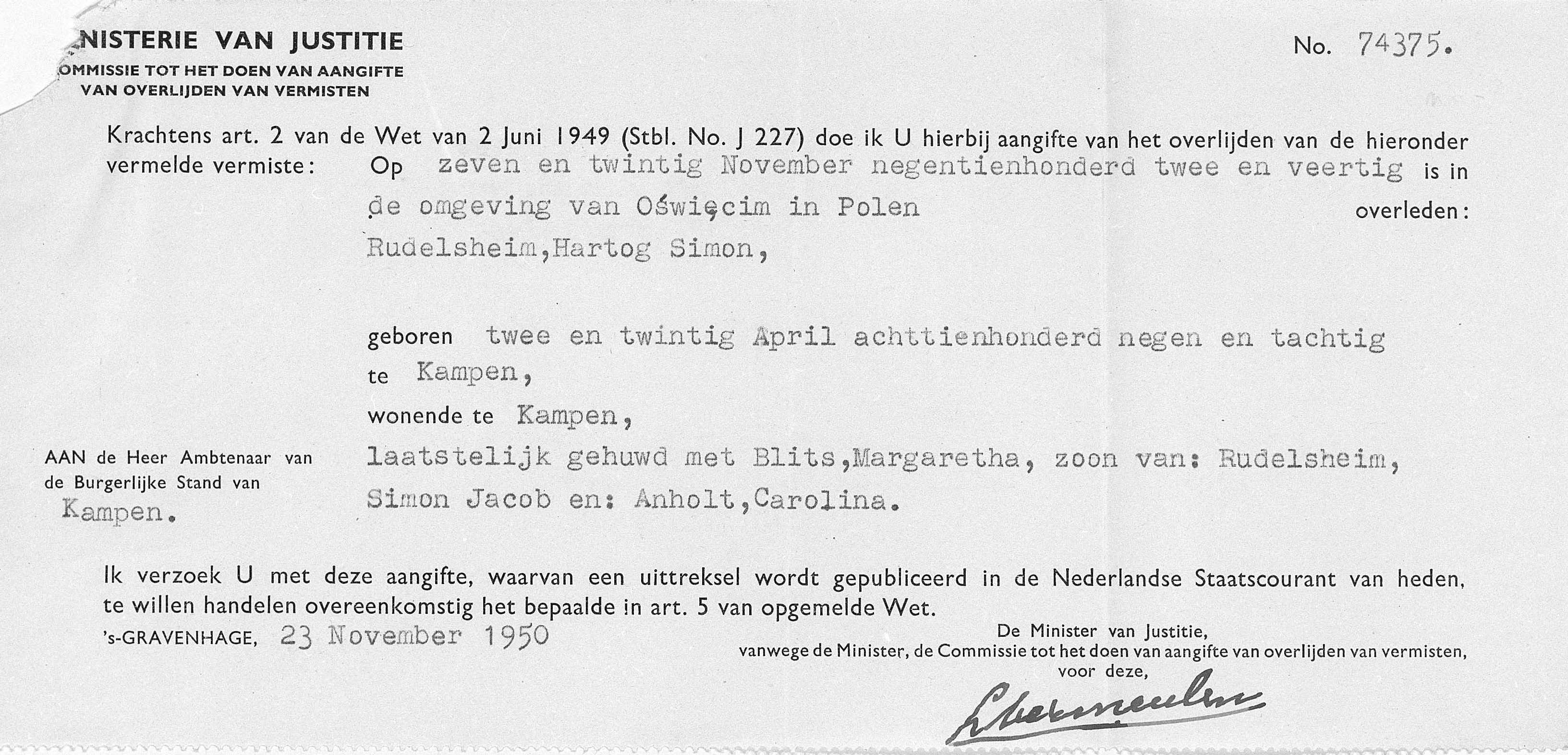 | Rudelsheim | Hertog Simon | 1889 | Kampen, The Netherlands | List of murdered Jews from the Netherlands |