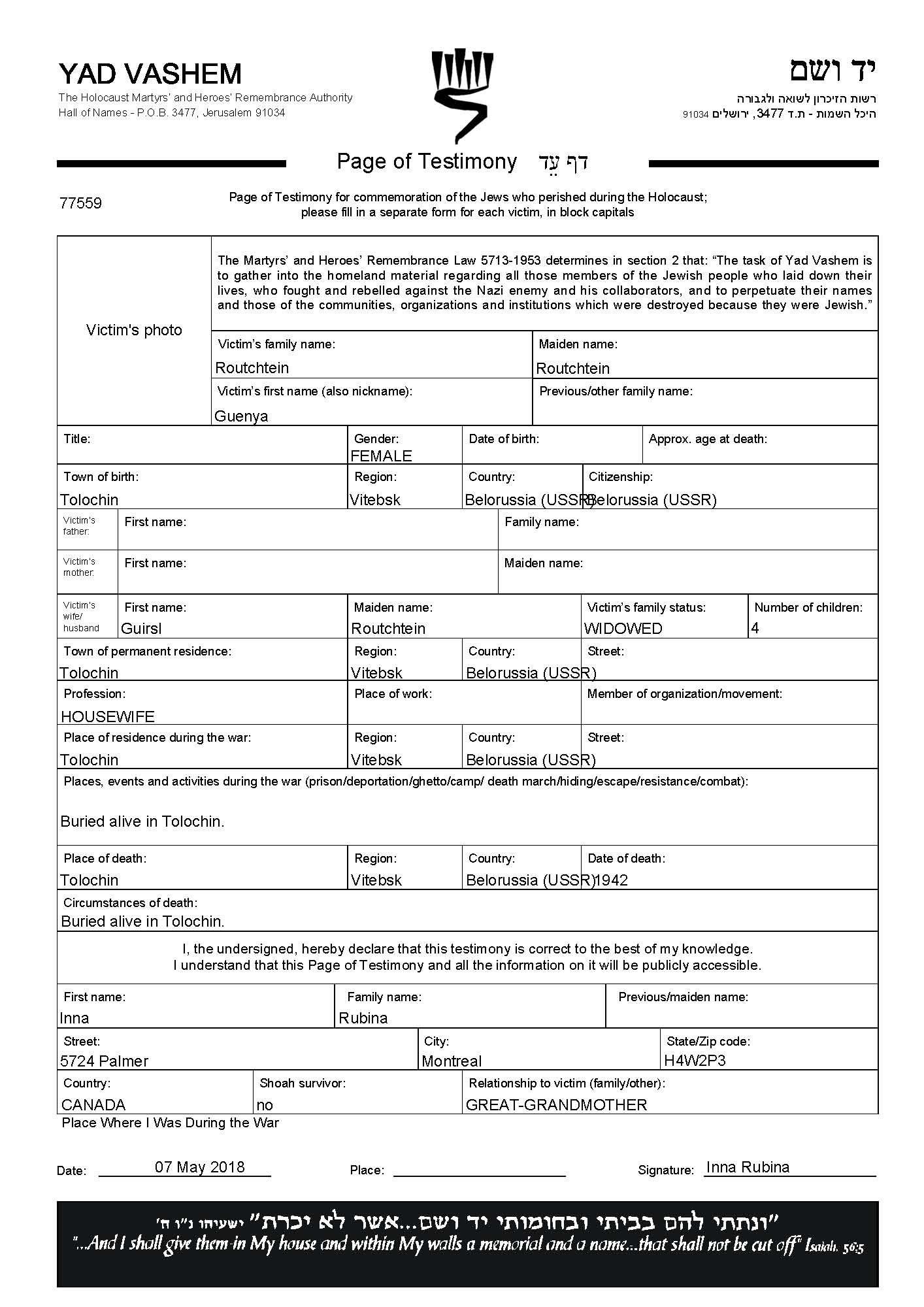 Guenya Routchtein nee Routchtein was born in Tolochin, Belorussia (USSR). She was a housewife and a widowed Guirsl. Prior to WWII she lived in Tolochin, Belorussia (USSR). During the war she was in Tolochin, Belorussia (USSR).