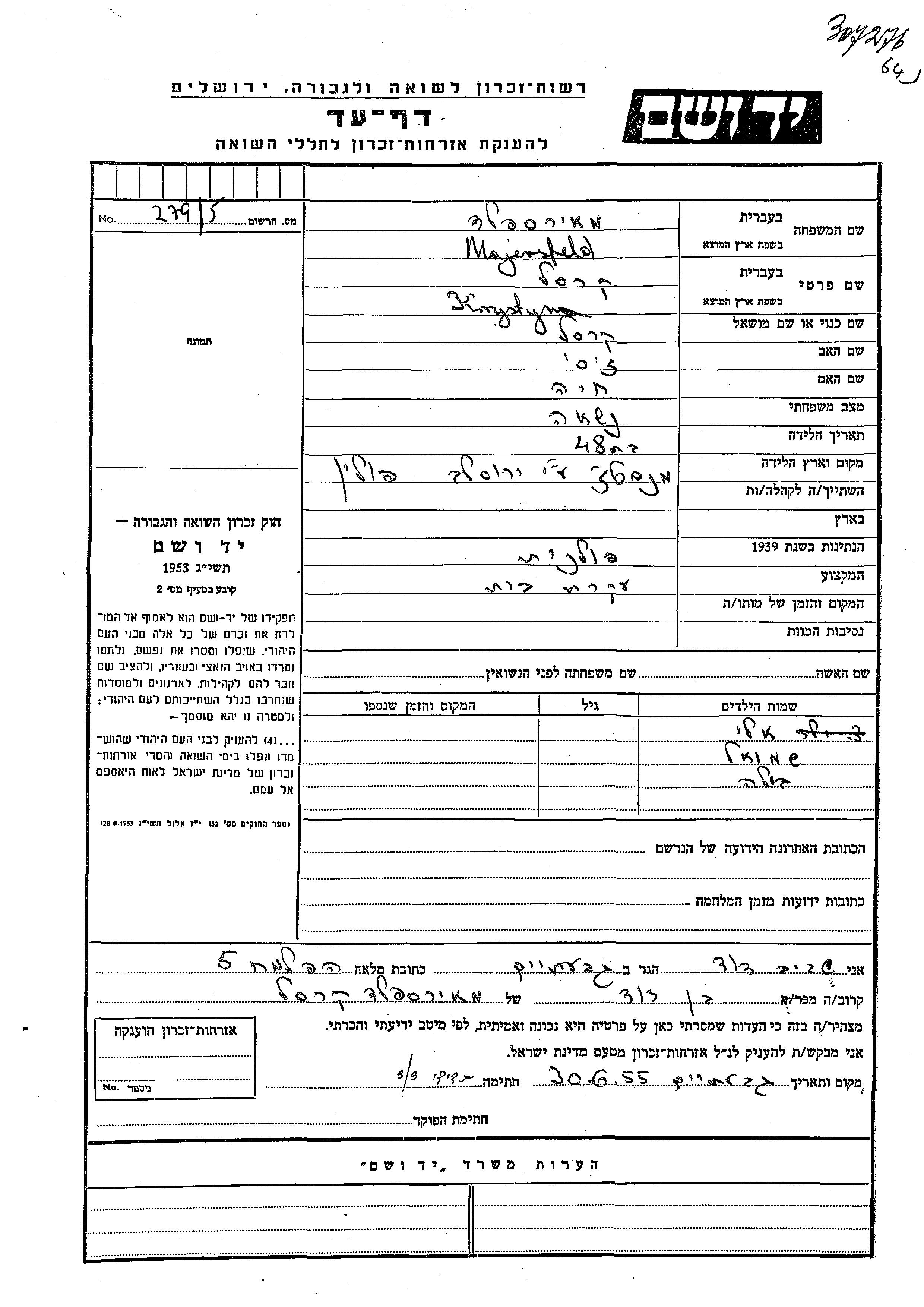 Majersfeld Krystyna Krusla unstated place, Page of Testimony