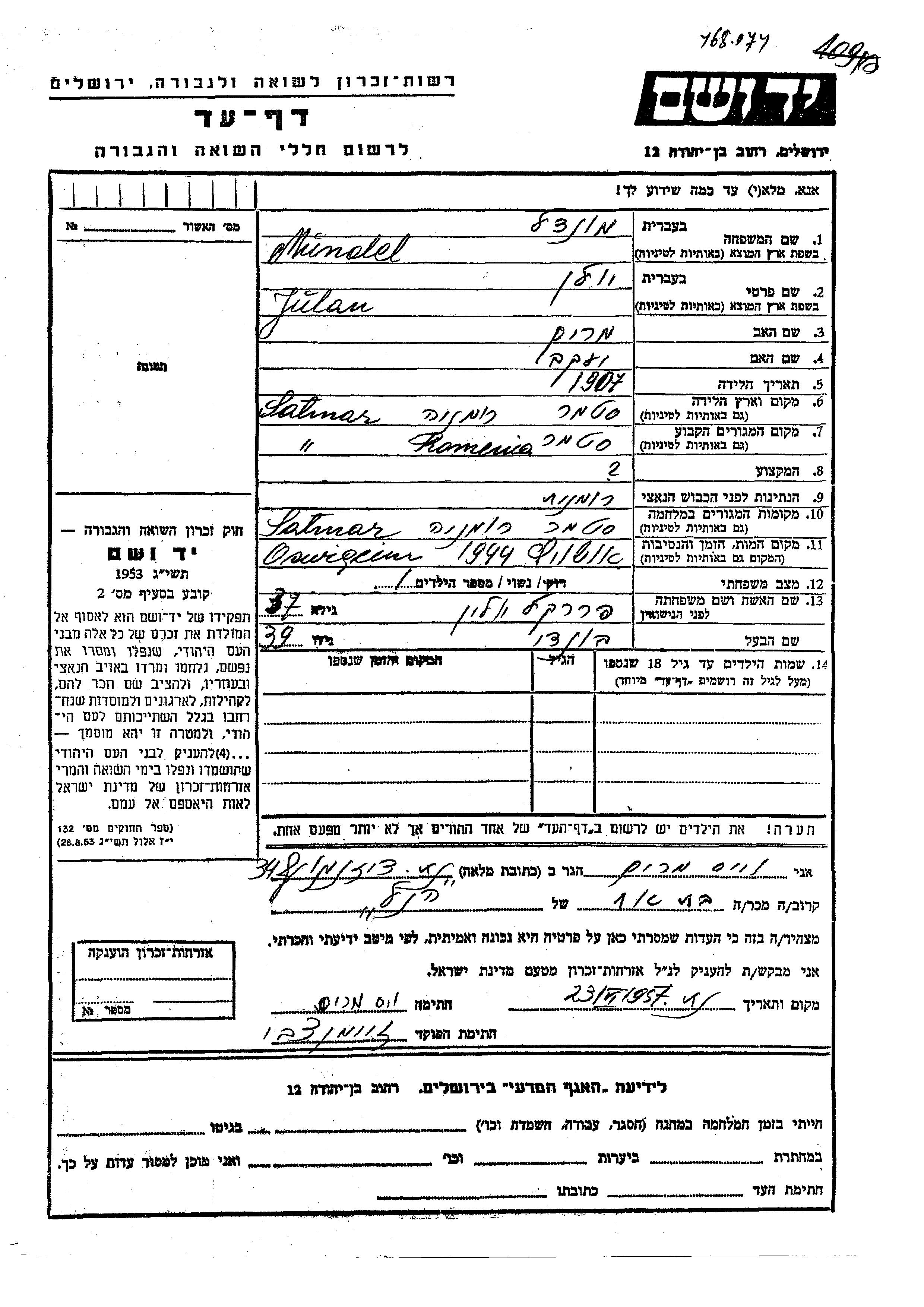 Muendel Yulan 1907 Satu Mare, Romania Page of Testimony