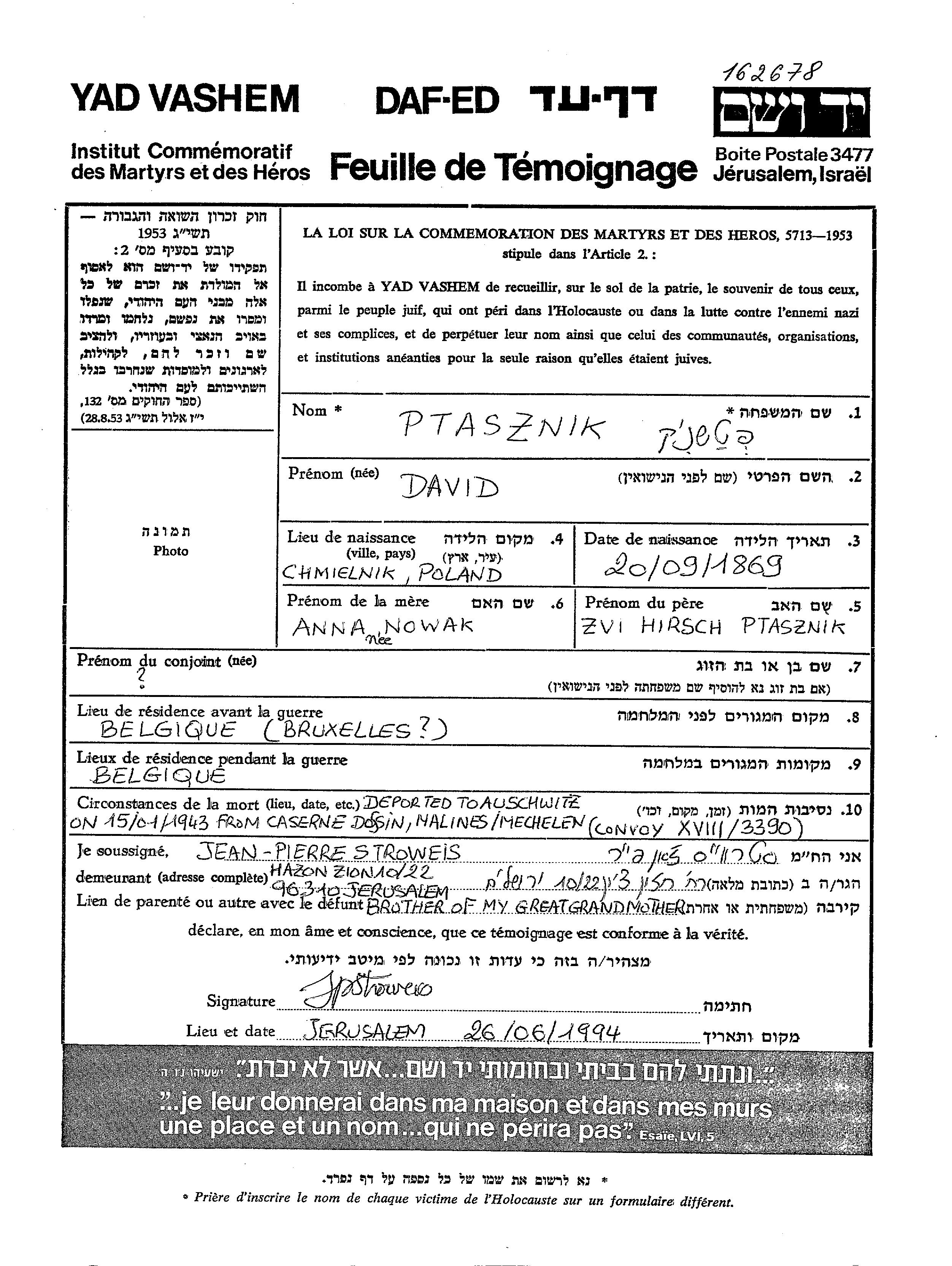 David Ptasznik was born, 1869. He was a without profession. Prior to WWII he lived in Bruxelles, Belgium.