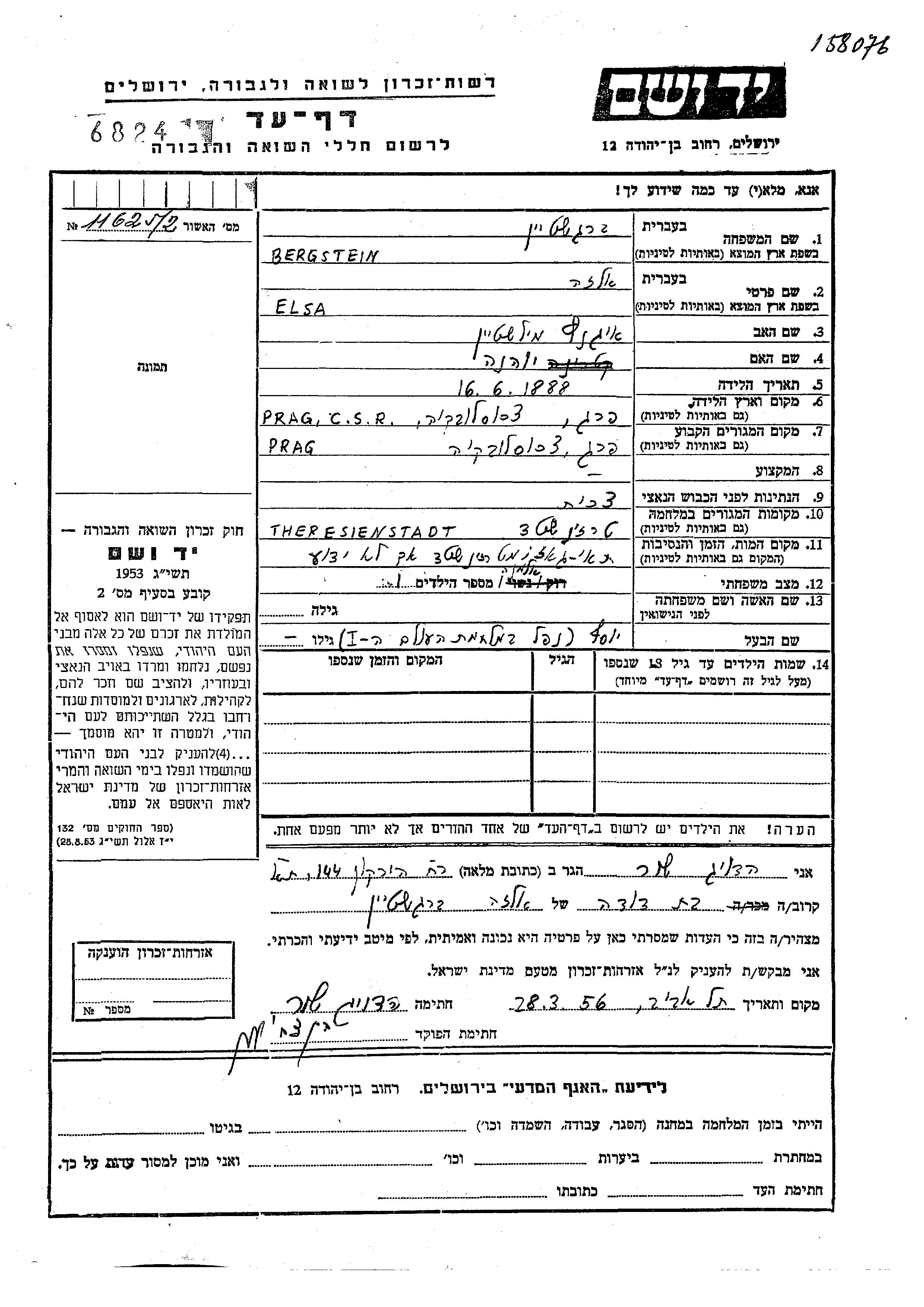 Elsa Bergstein nee Milshtein was born in Prague, Czechoslovakia, 1888. Prior to WWII she lived in Prague, Czechoslovakia.