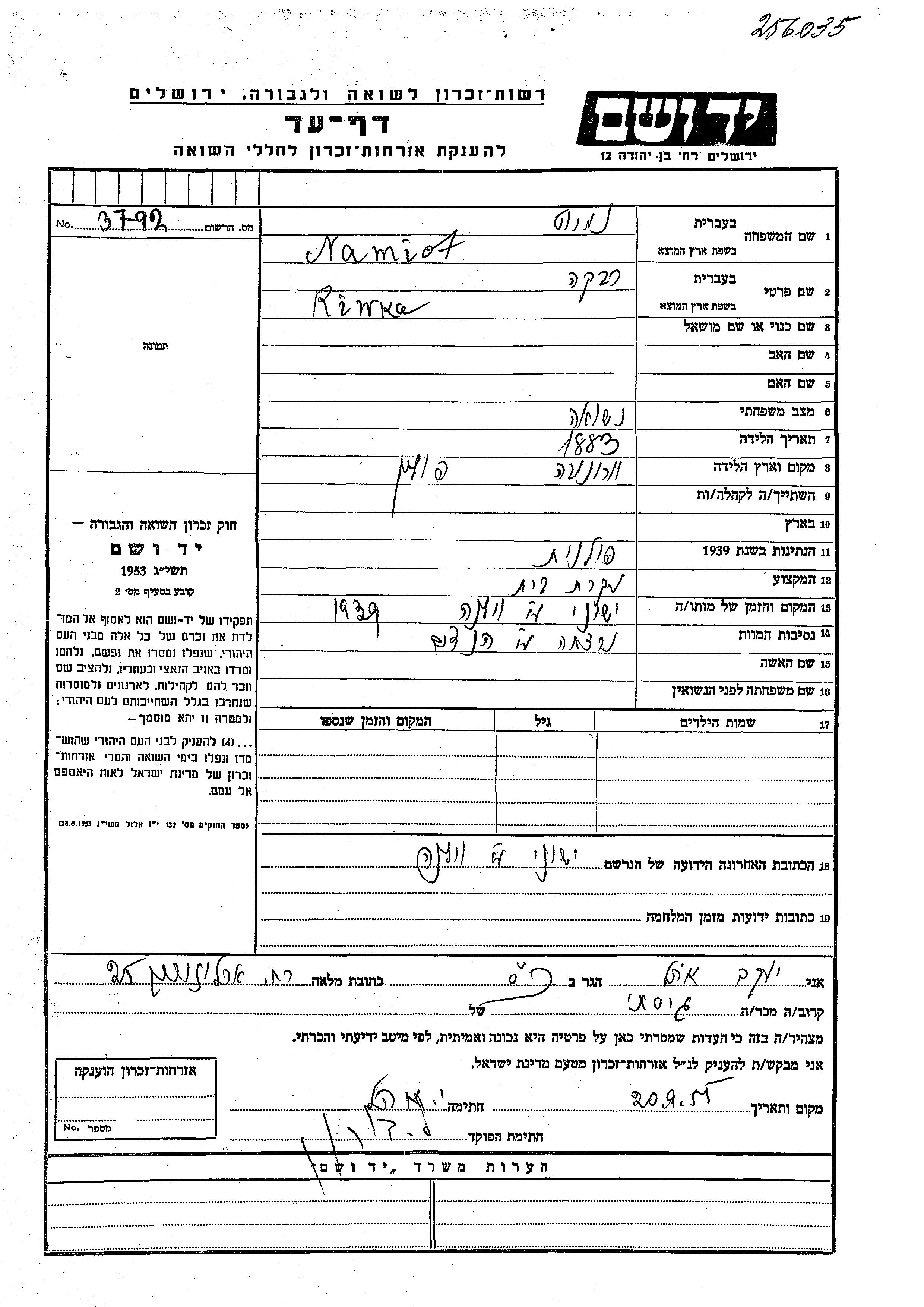 Riwka Namiot was born in Woronowo, Poland, 1883. She was a housewife and married. Prior to WWII she lived in Jaszuny, Poland. During the war she was in Jaszuny, Poland. Riwka was murdered in the Shoah. Place of death: Jaszuny, Poland, 1939.