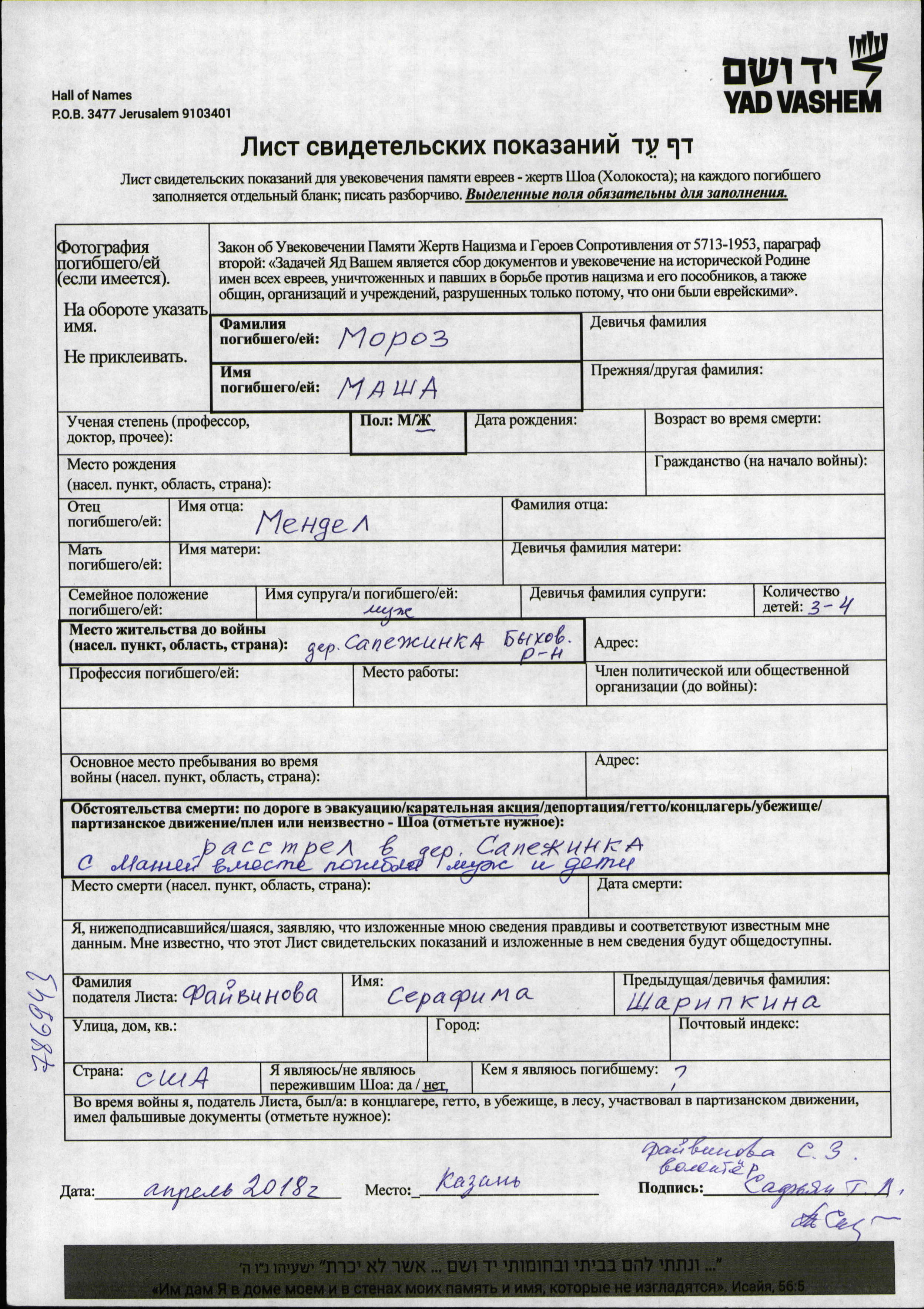 Masha Moroz was born to Mendel. She was married. Prior to WWII she lived in Sapezhinka, Belorussia (USSR). During the war she was in Sapezhinka, Belorussia (USSR). Masha was murdered in the Shoah. Place of death: Sapezhinka, Belorussia (USSR).