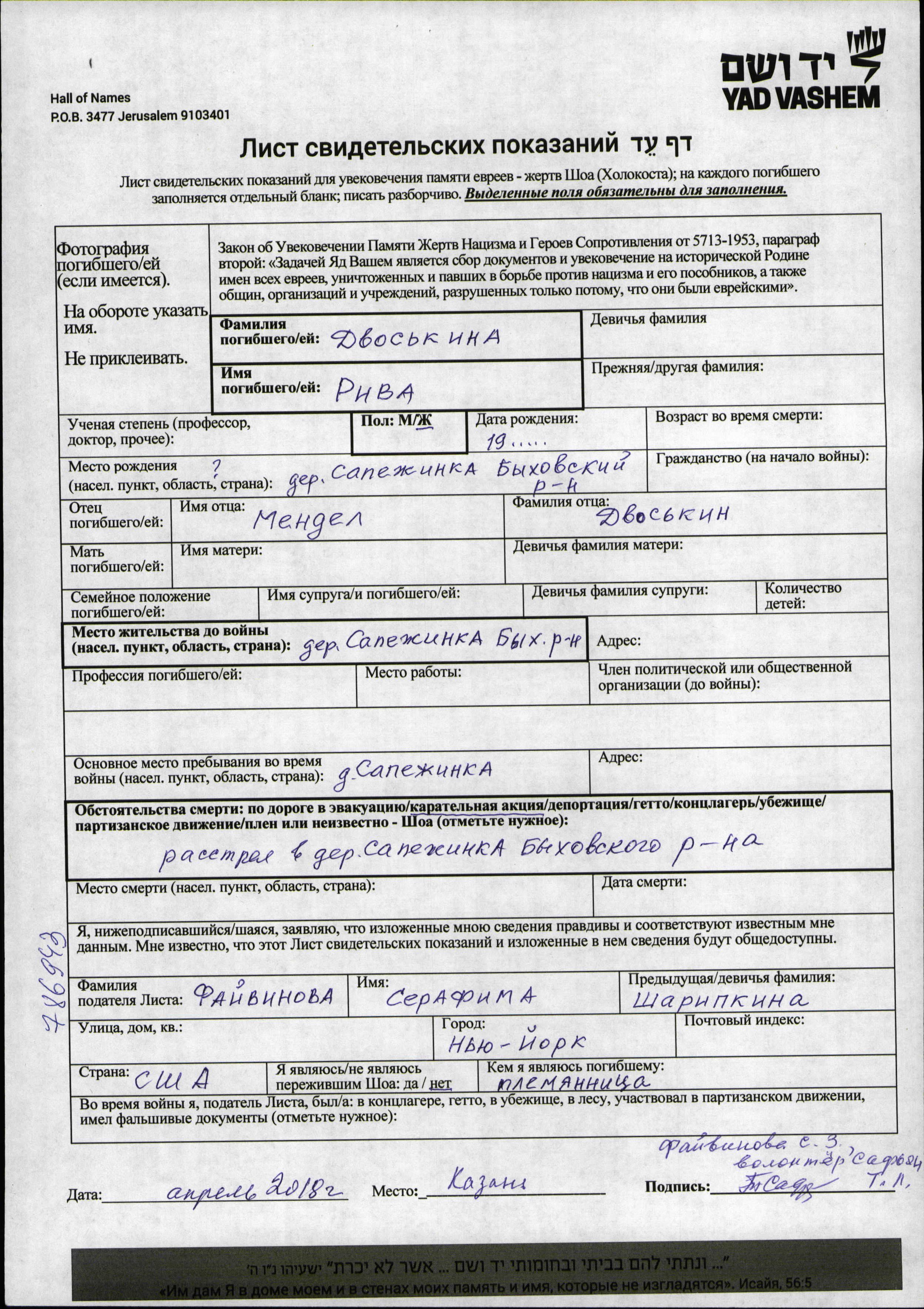 Riva Dvoskina was born in Sapezhinka, Belorussia (USSR) to Mendel. Prior to WWII she lived in Sapezhinka, Belorussia (USSR). During the war she was in Sapezhinka, Belorussia (USSR). Riva was murdered in the Shoah. Place of death: Sapezhinka, Belorussia (USSR).