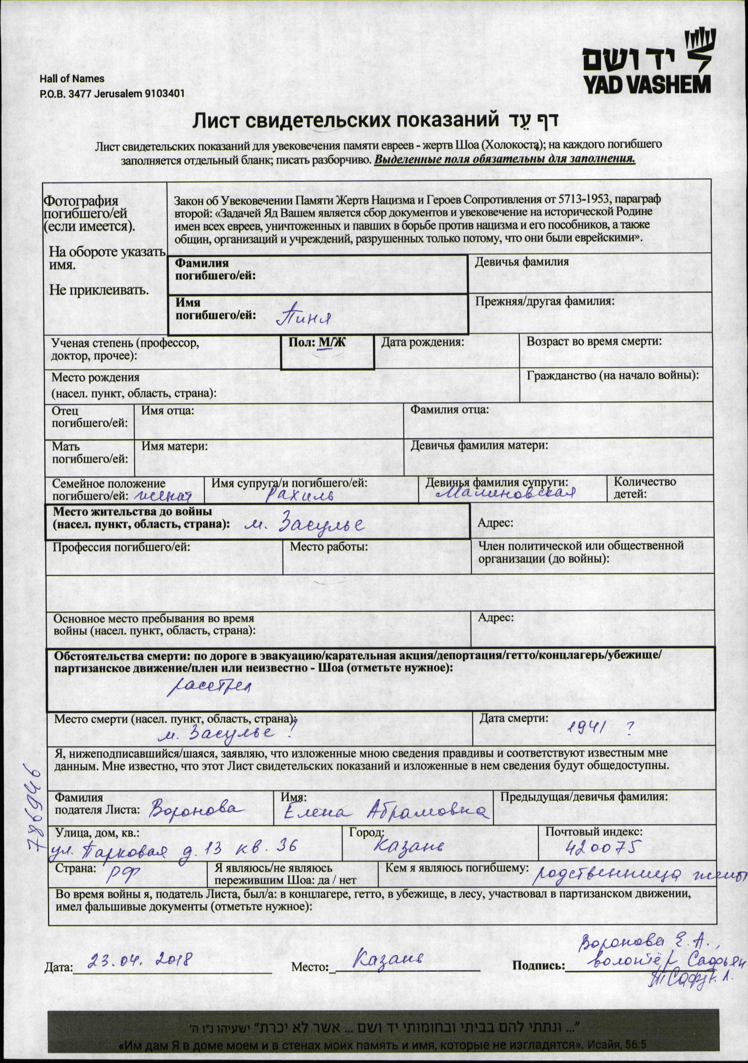 Pinya Surname unknown. He was married to Rakhil nee Malinovskaya. Prior to WWII he lived in Zasulye, Ukraine (USSR). During the war he was in Zasulye, Ukraine (USSR). Pinya was murdered in the Shoah. Place of death: Zasulye, Ukraine (USSR), 1941.