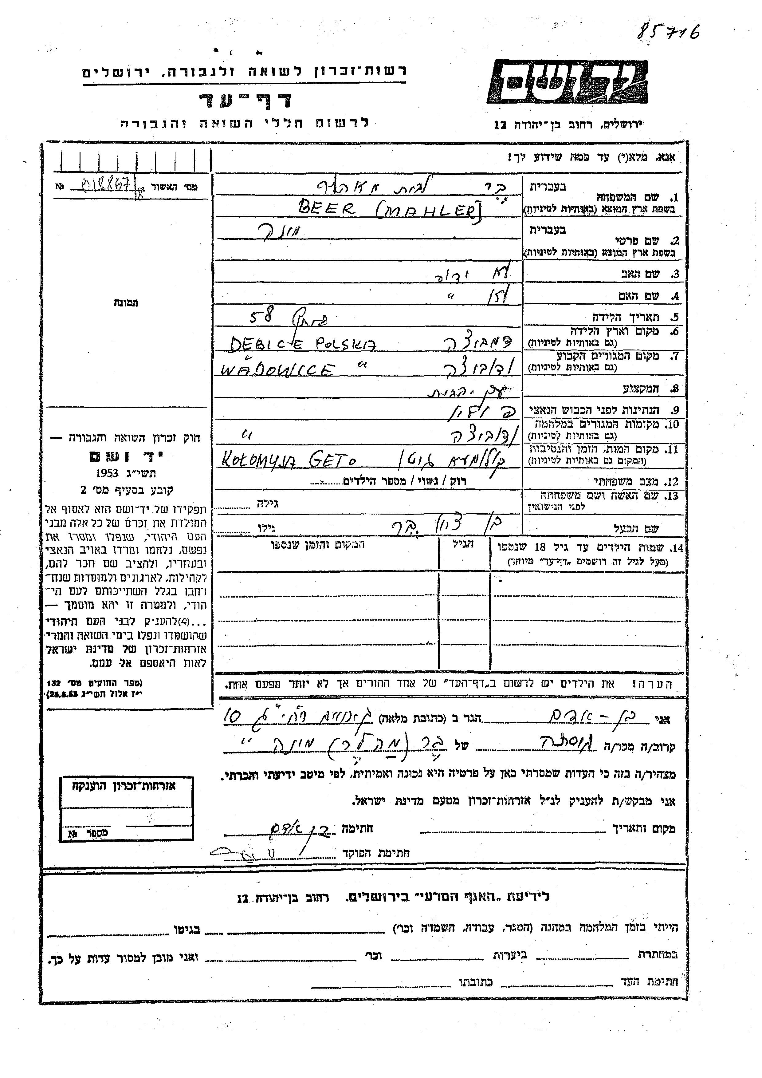 Mina Beer nee Mahler was born in Debica, Poland. She was a housewife and married to Bentzion. Prior to WWII she lived in Wadowice, Poland. During the war she was in Wadowice, Poland. Mina was murdered in the Shoah. Place of death: Kolomyja, Poland.