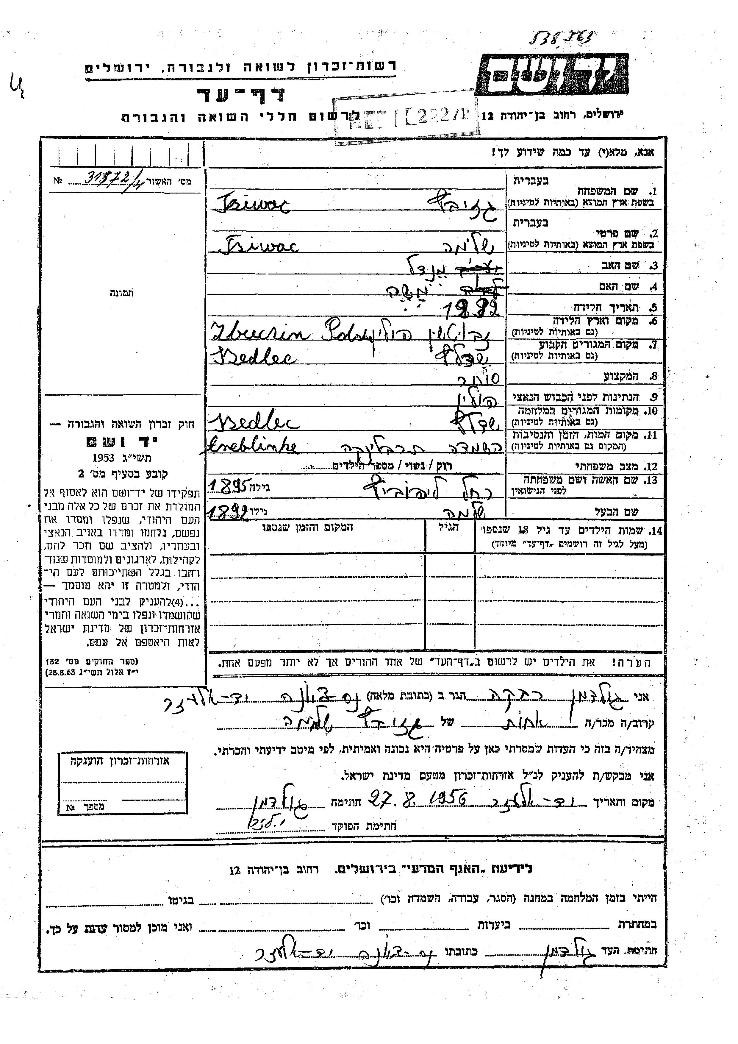 Gziwac Shlomo 1892 Siedlce, Poland Page of Testimony