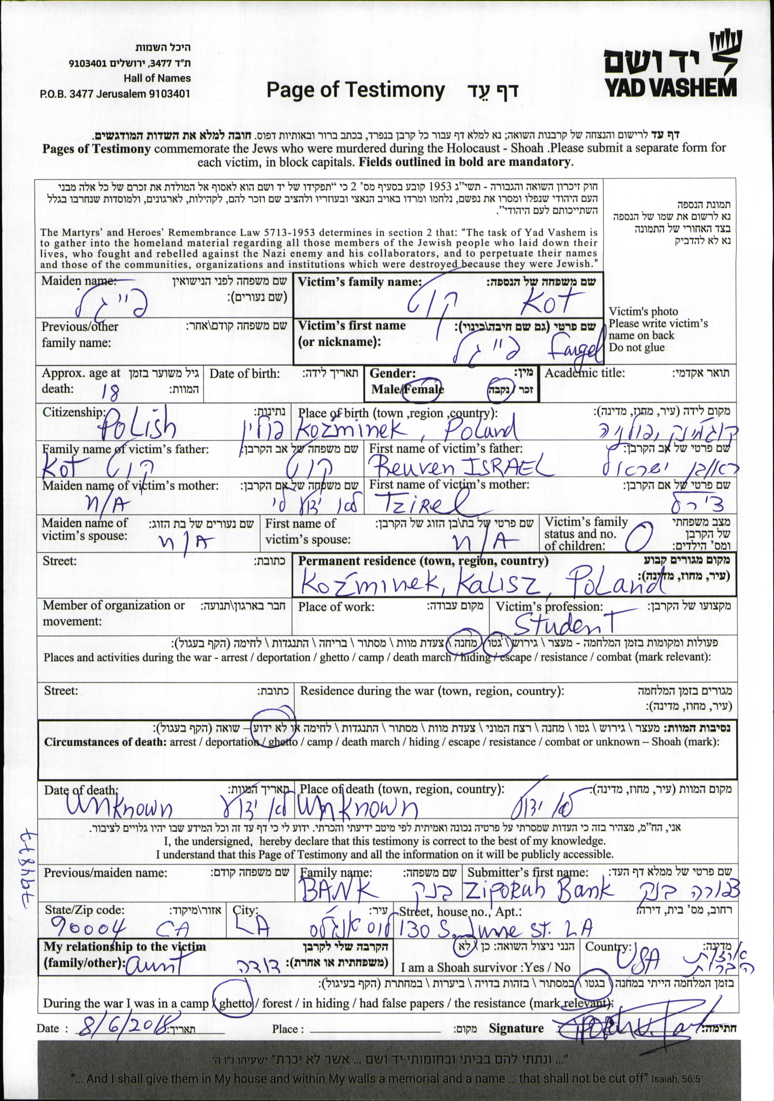 Kot Faigel Kozminek, Poland Page of Testimony