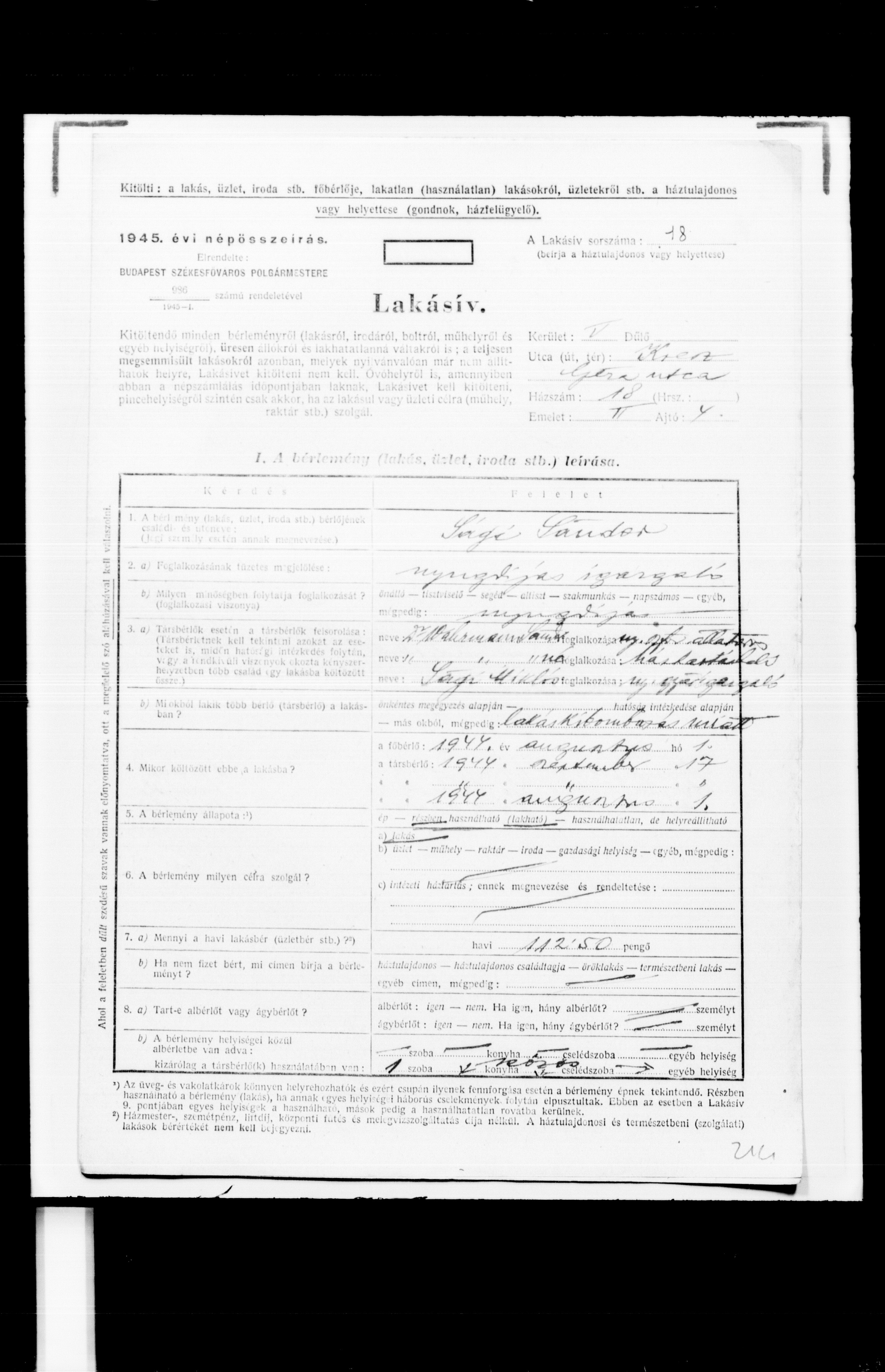 Questionnaire filled out by Sági Sándor, residing at Kresz Géza u. 18/4, Quarter V, in the context of the Population Census in Budapest, 1945