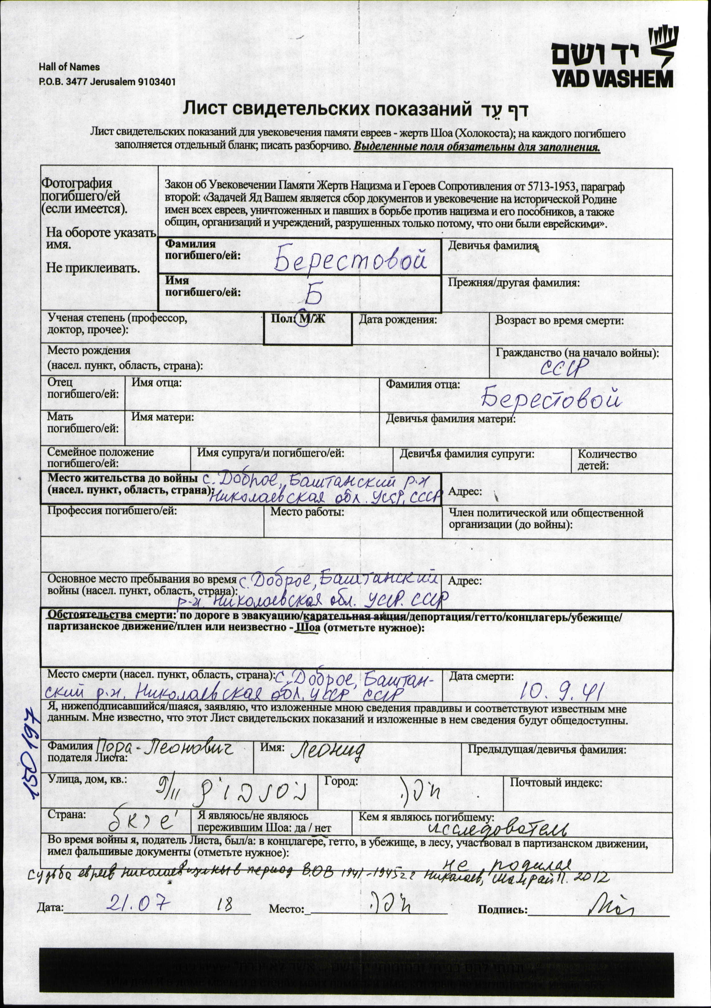 B Berestovoy. Prior to WWII he lived in Dobroye, Ukraine (USSR). During the war he was in Dobroye, Ukraine (USSR). B was murdered in the Shoah. Place of death: Dobroye, Ukraine (USSR), 10/09/1941.