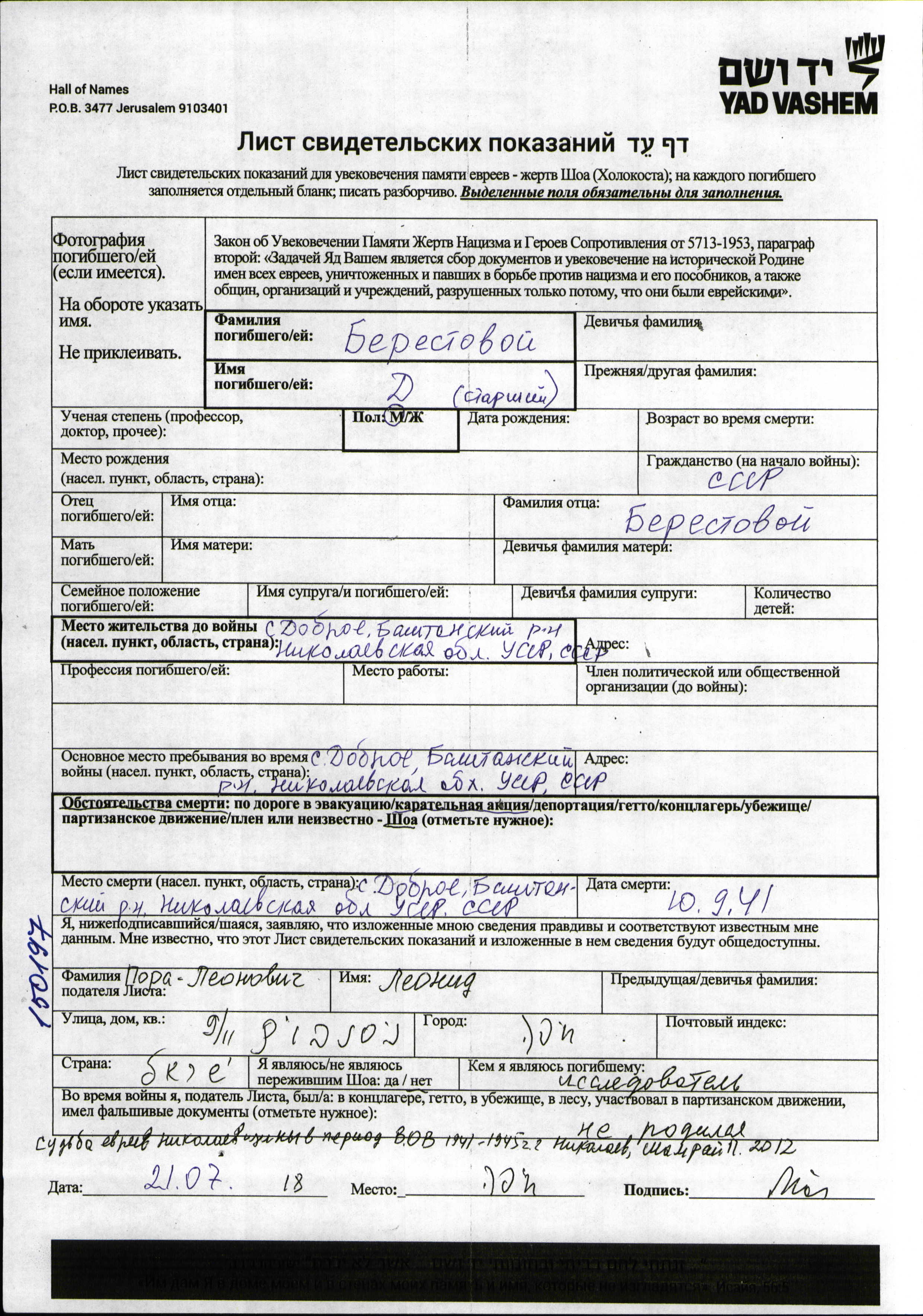 Berestovoy D Dobroye, Ukraine (USSR) Page of Testimony