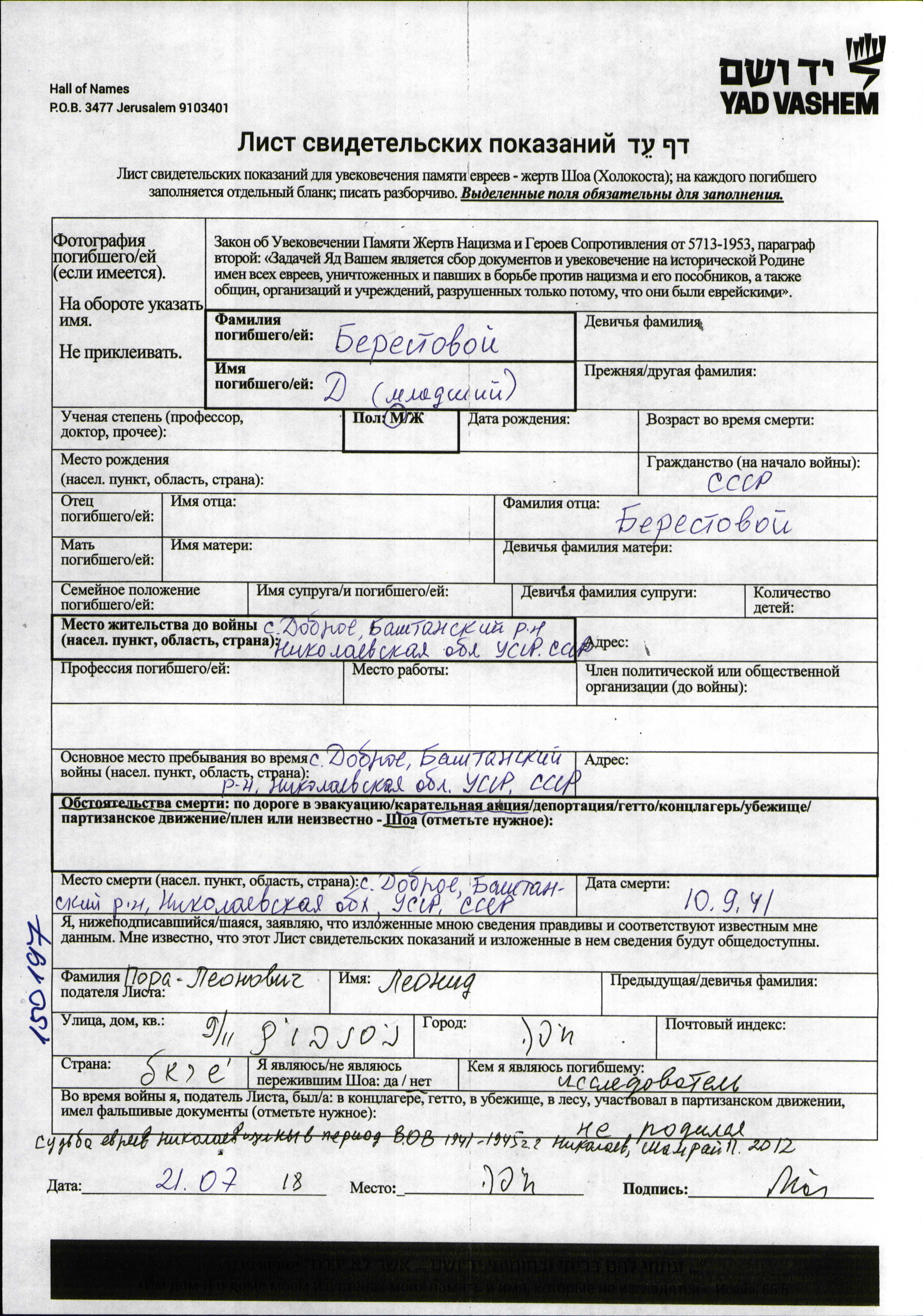D Berestovoy. Prior to WWII he lived in Dobroye, Ukraine (USSR). During the war he was in Dobroye, Ukraine (USSR). D was murdered in the Shoah. Place of death: Dobroye, Ukraine (USSR), 10/09/1941.