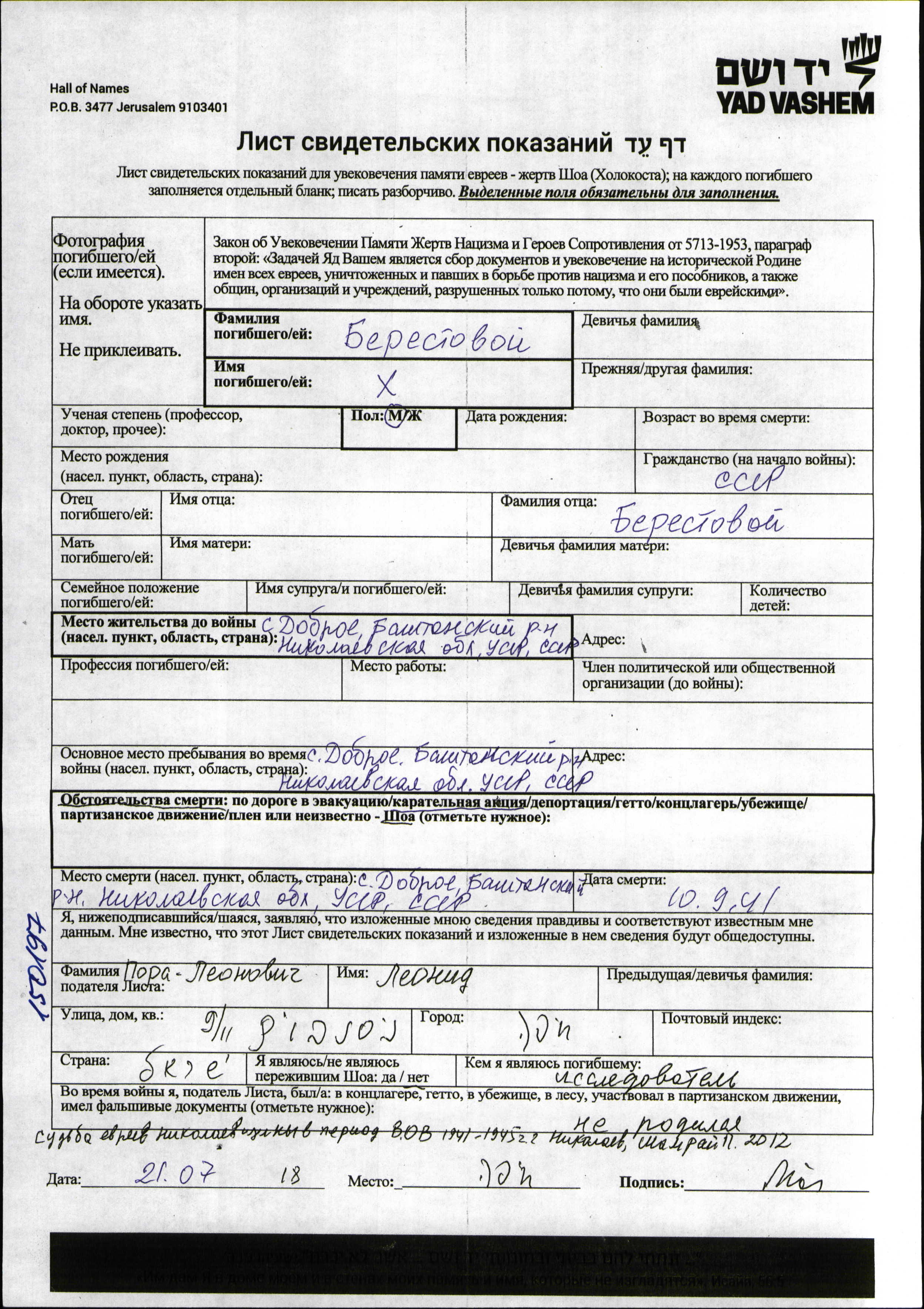Kh Berestovoy. Prior to WWII he lived in Dobroye, Ukraine (USSR). During the war he was in Dobroye, Ukraine (USSR). Kh was murdered in the Shoah. Place of death: Dobroye, Ukraine (USSR), 10/09/1941.
