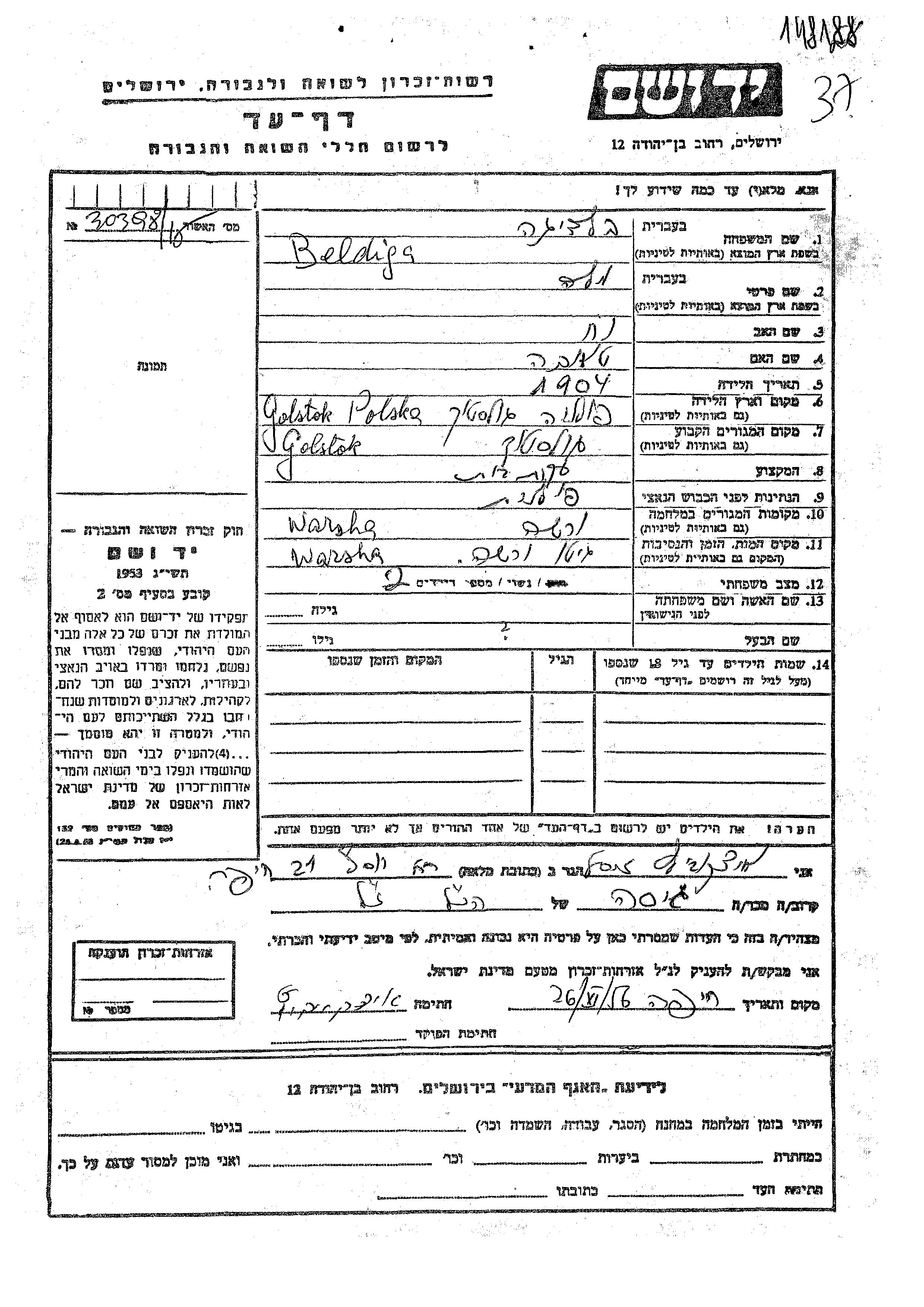 Mala Beldiga was born in Golstok, Poland, 1904 to Noakh and Taba. She was a housewife and married. Prior to WWII she lived in Golstok, Poland. During the war she was in Varsha, Poland. Mala was murdered in the Shoah. Place of death: Varsha, Poland.
