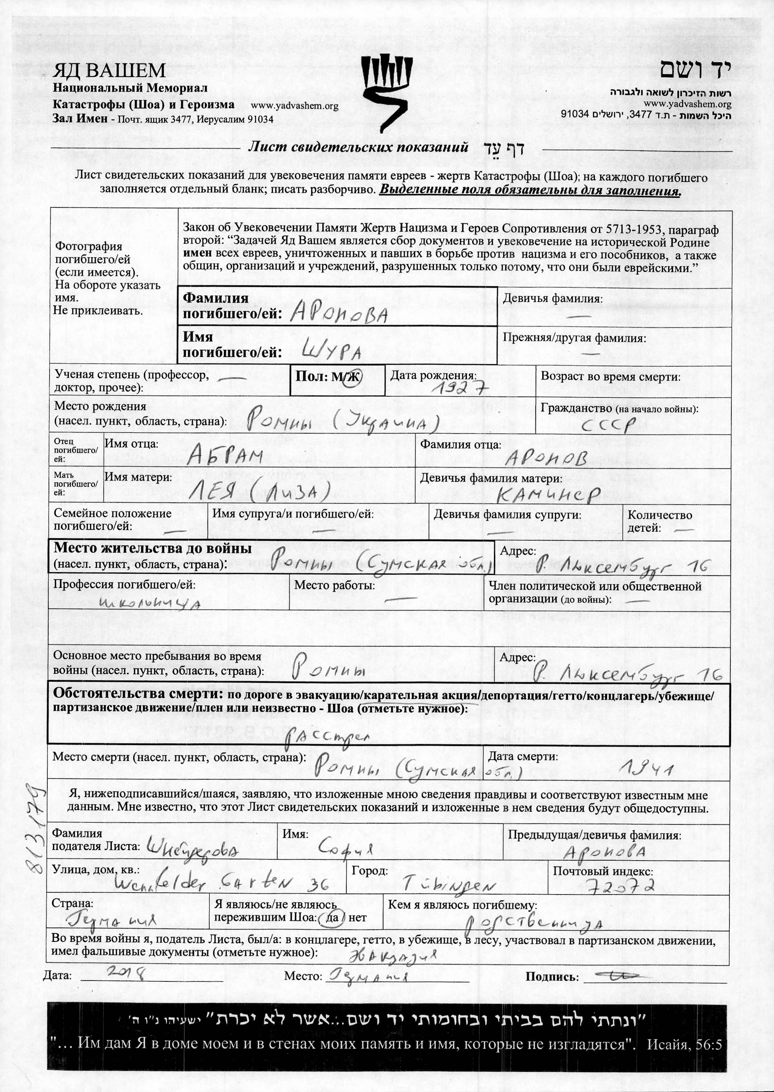 Shura Aronova was born in Romny, Ukraine (USSR), 1927 to Abram and Leya Liza nee Kaminer. She was a pupil and child. Prior to WWII she lived in Romny, Ukraine (USSR). During the war she was in Romny, Ukraine (USSR). Shura was murdered in the Shoah. Place of death: Romny, Ukraine (USSR), 1941.