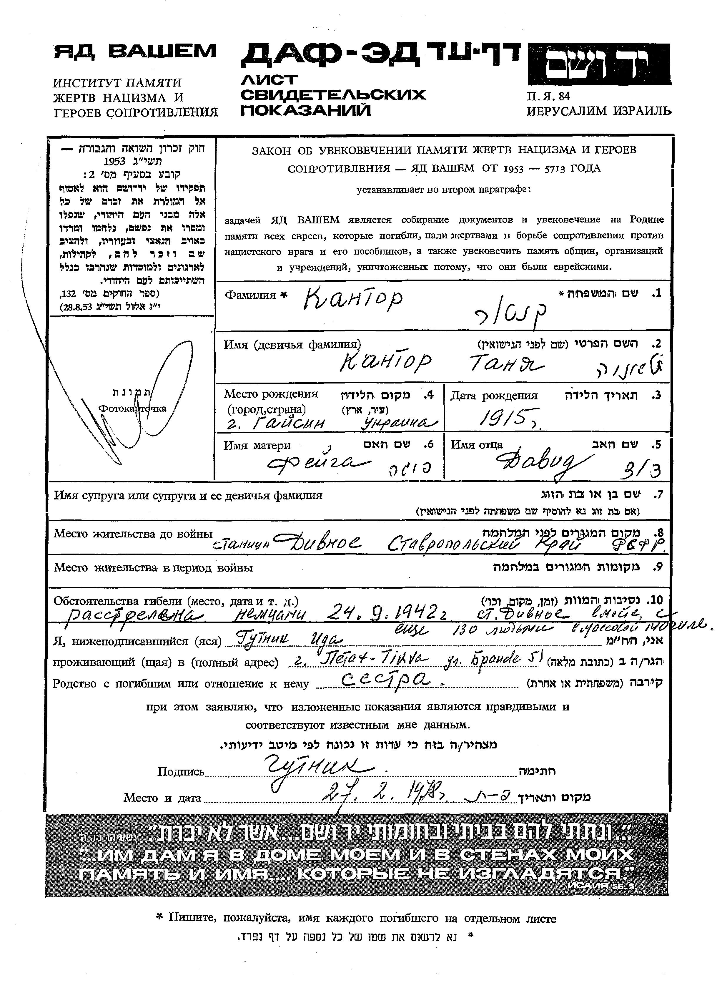 Tania Kantor Dultzeva nee Kantor was born in Gaisin, Ukraine (USSR), 1915. She was a teacher. Prior to WWII she lived in Divnoye, Russia (USSR). Tania was murdered in the Shoah. Place of death: Divnoye, Russia (USSR), 24/09/1942.
