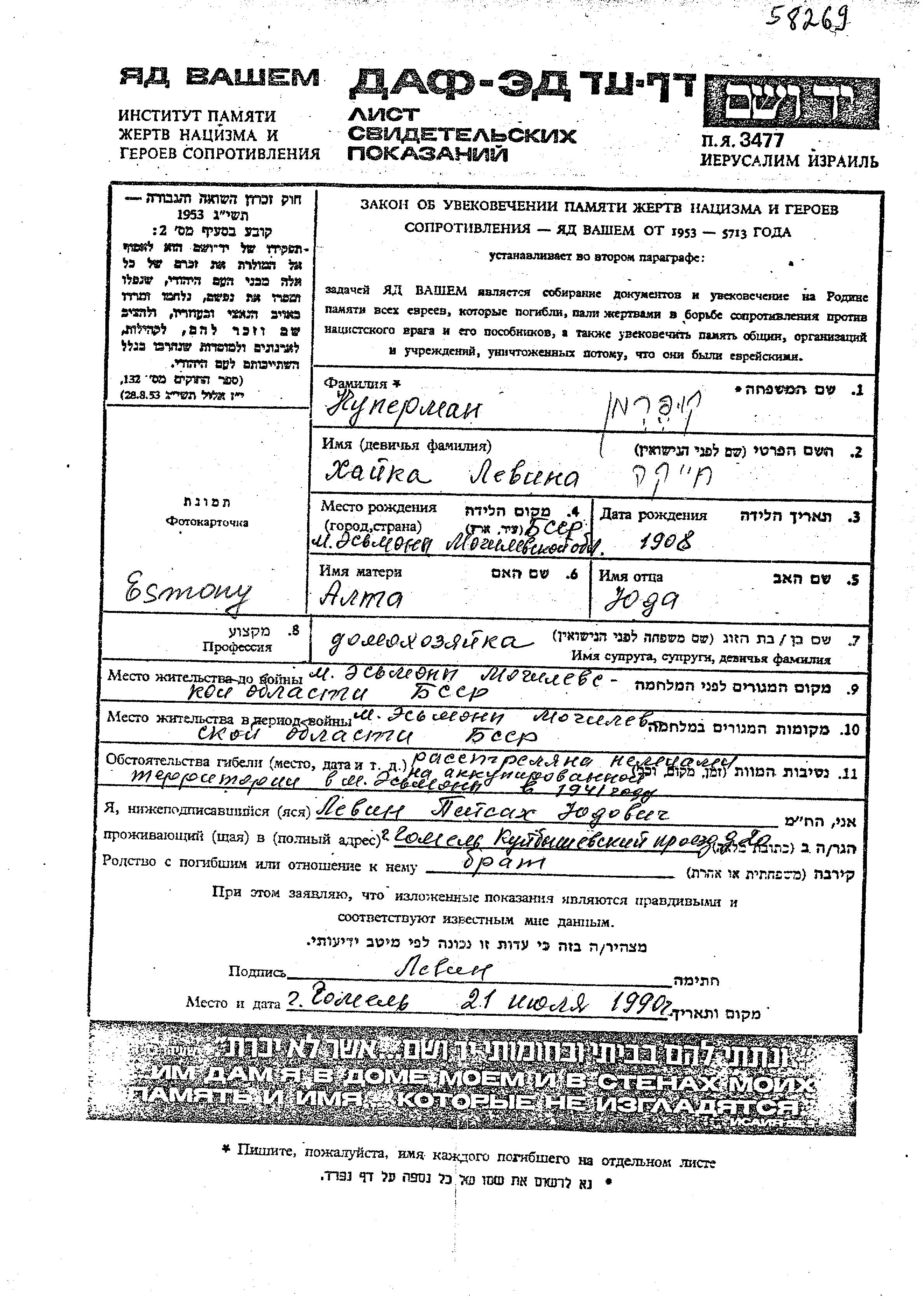 Khaika Kuperman nee Levin was born in Esmony, Belorussia (USSR), 1908. She was a housewife. Prior to WWII she lived in Esmony, Belorussia (USSR). Khaika was murdered in the Shoah. Place of death: Esmony, Belorussia (USSR), 1941.