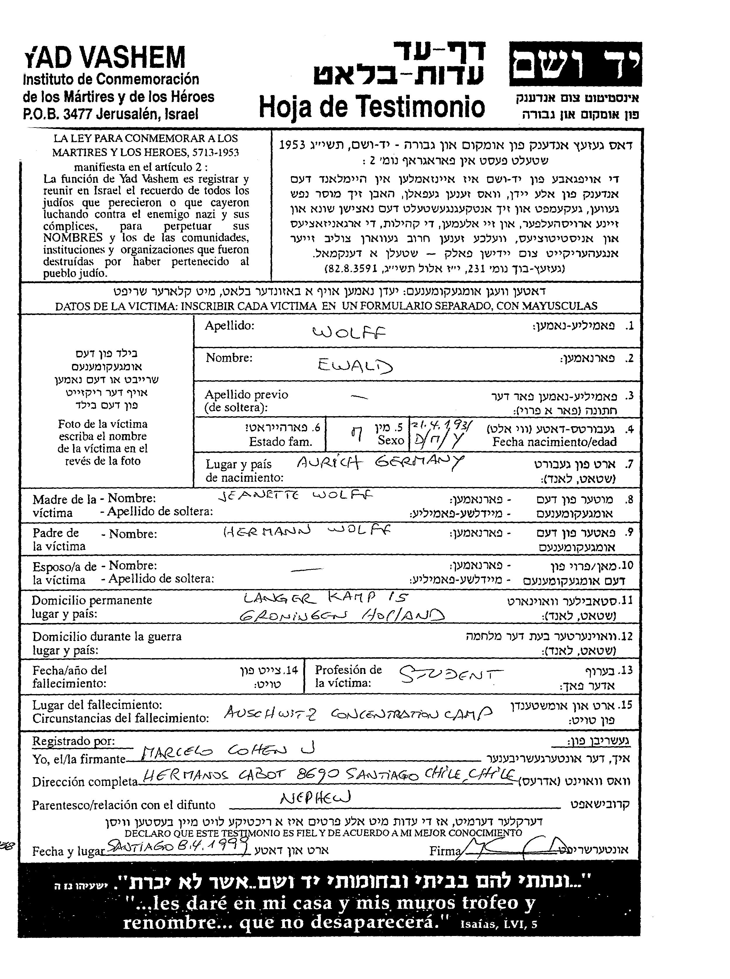 Wolff Ewald 1931 Groningen, The Netherlands Page of Testimony