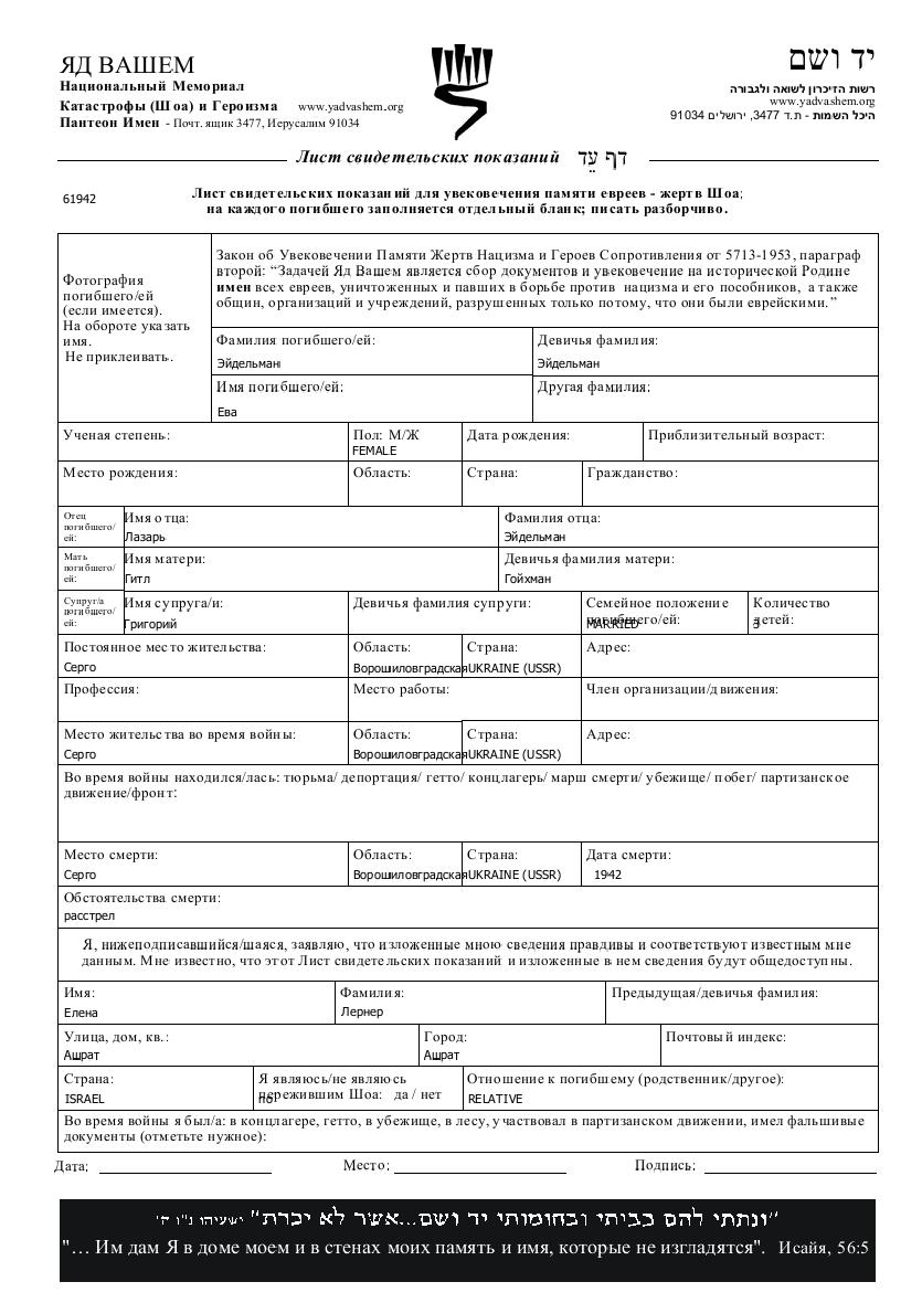 Eidelman Yeva Sergo, Ukraine (USSR) Page of Testimony (digital)