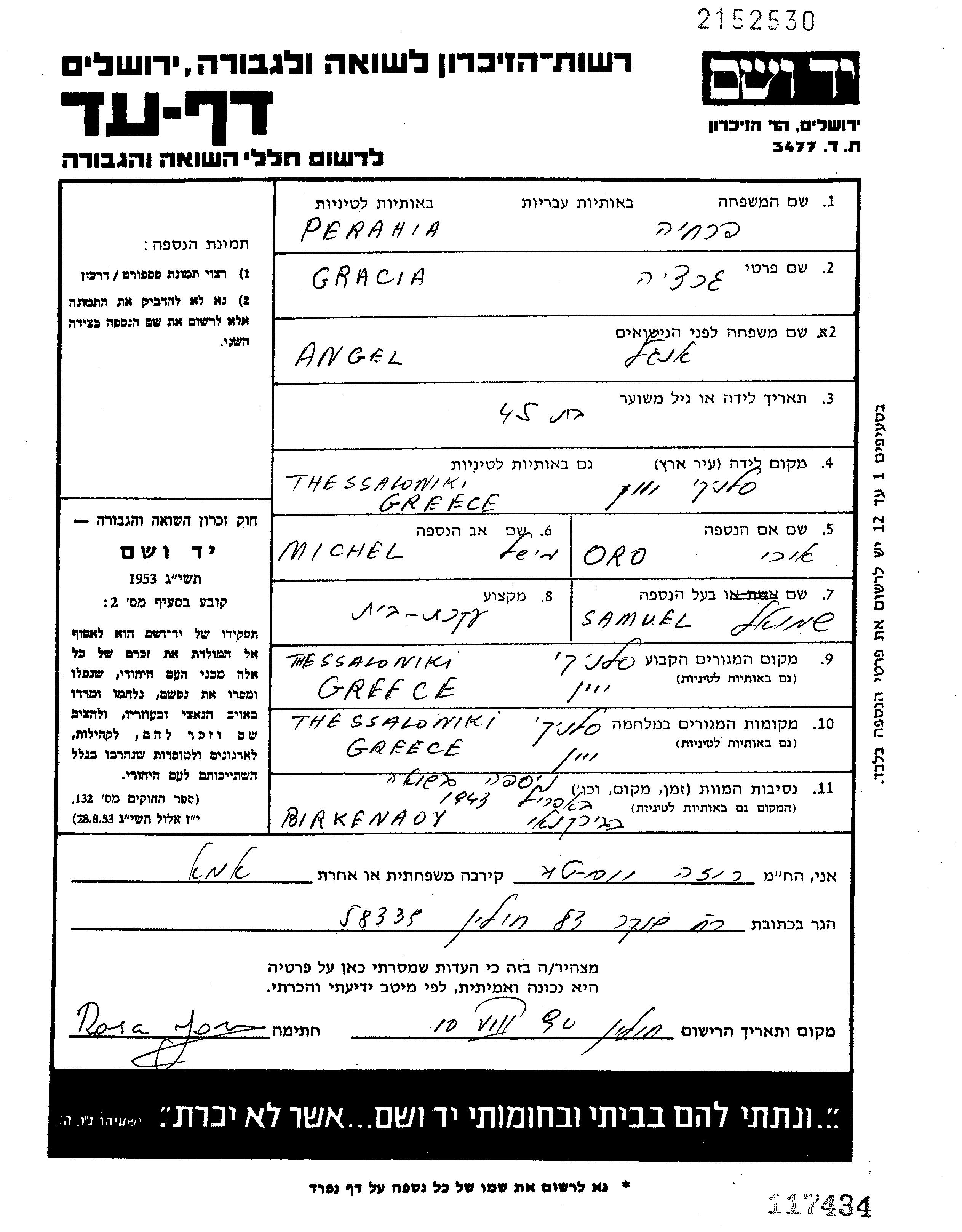 | Perahia | Gracia | Thessaloniki, Greece | Page of Testimony | |