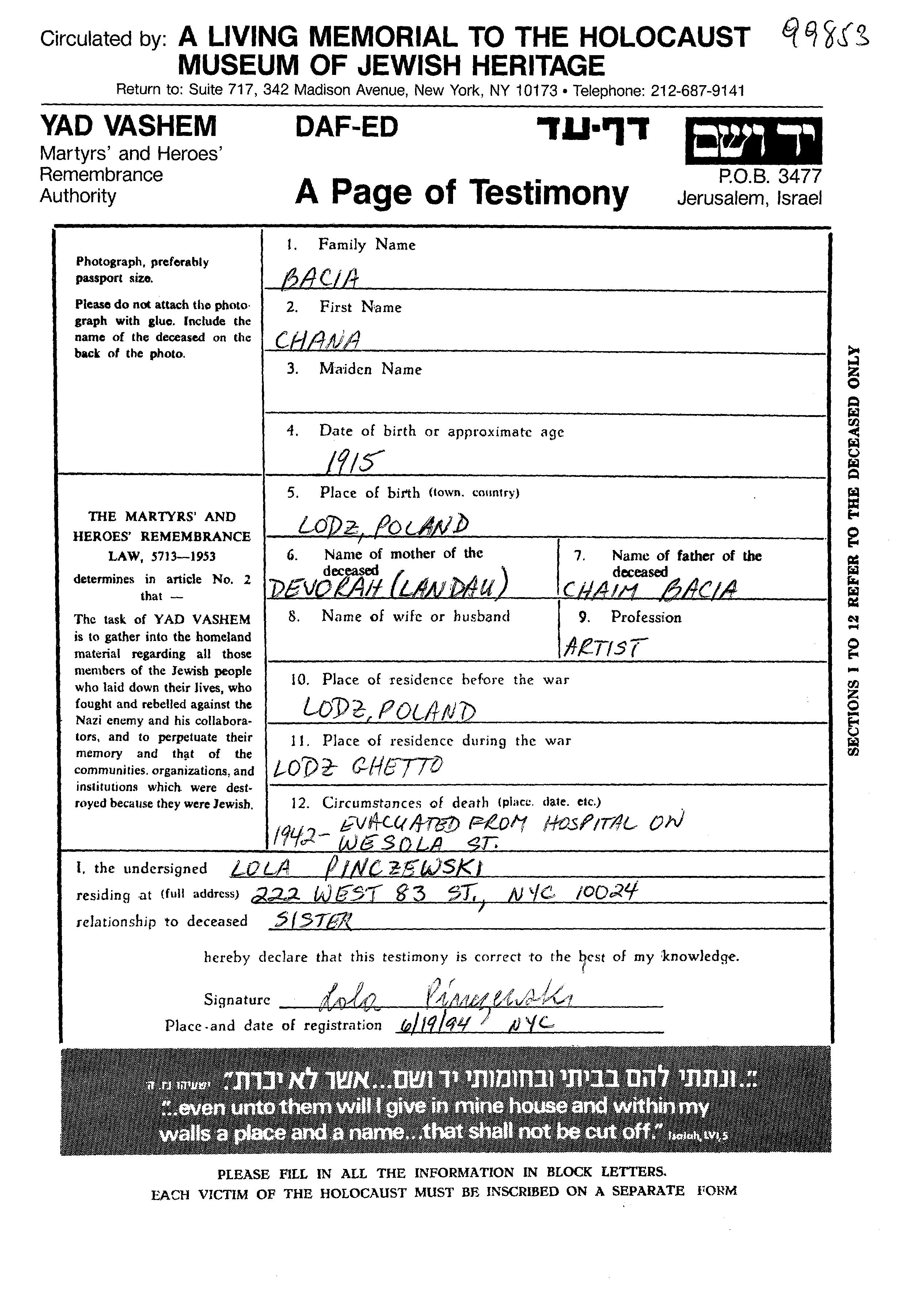 Khana Bacia was born in Lodz, Poland, 1915. She was a craftsman / artist. Prior to WWII she lived in Lodz, Poland. Khana was murdered in the Shoah. Place of death: unstated place, 1942.