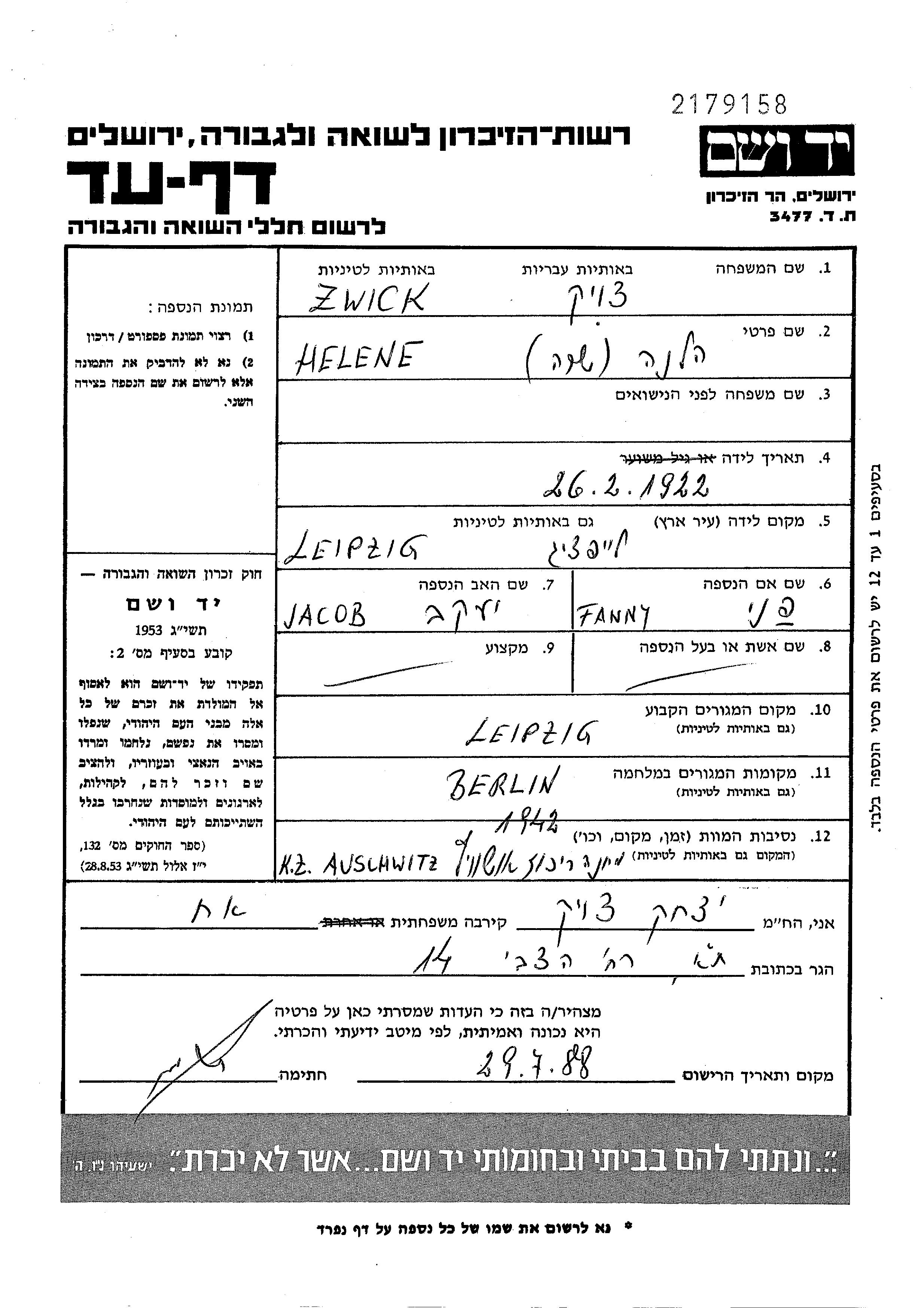Zwick | Helene | 1922 | Leipzig, Germany | Page of Testimony |