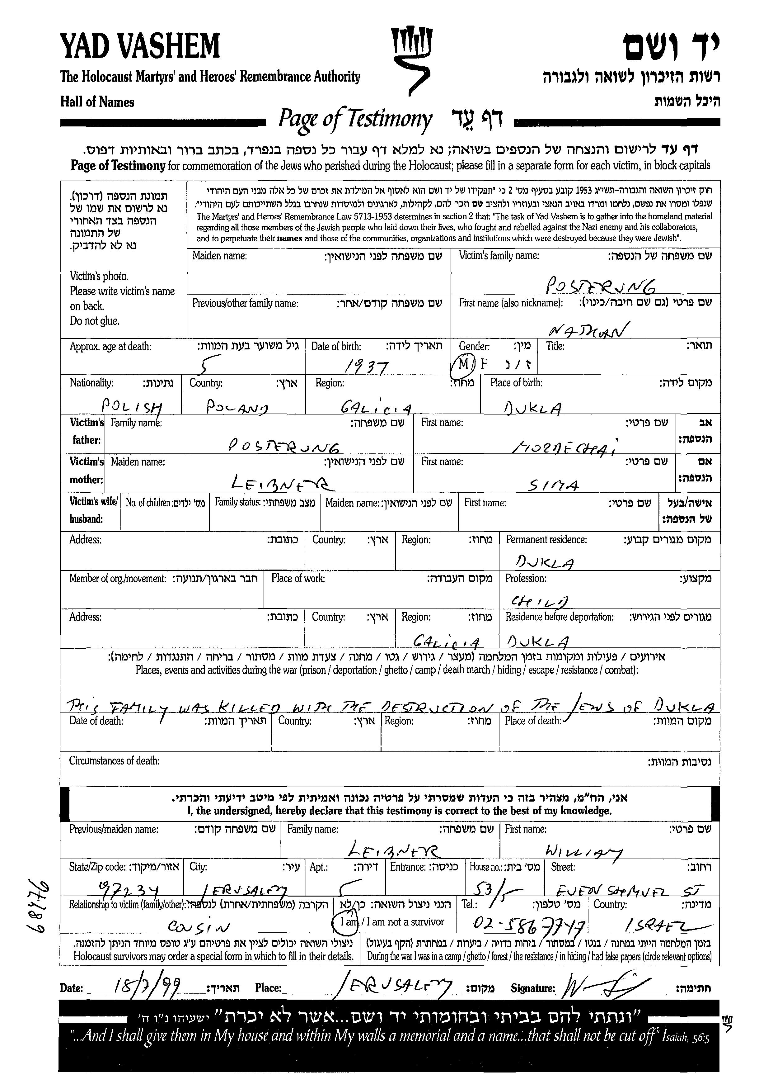 Posterung Nathan 1937 Dukla, Poland Page of Testimony