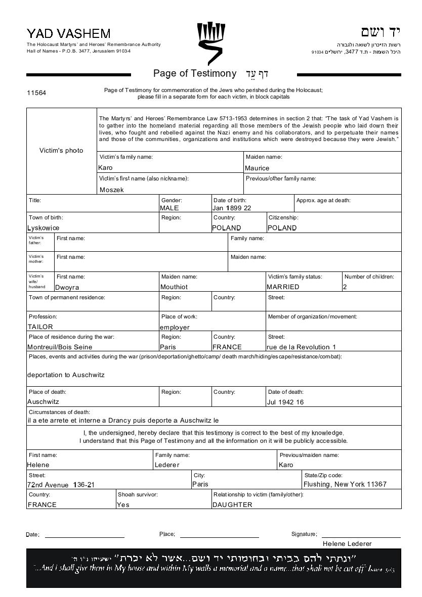 Maurice Moszek Karo was born in Lyszkowice, Poland, 1899. He was a tailor. Prior to WWII he lived in Poland. Maurice Moszek was murdered in the Shoah. Place of death: Auschwitz, Poland, 16/07/1942.