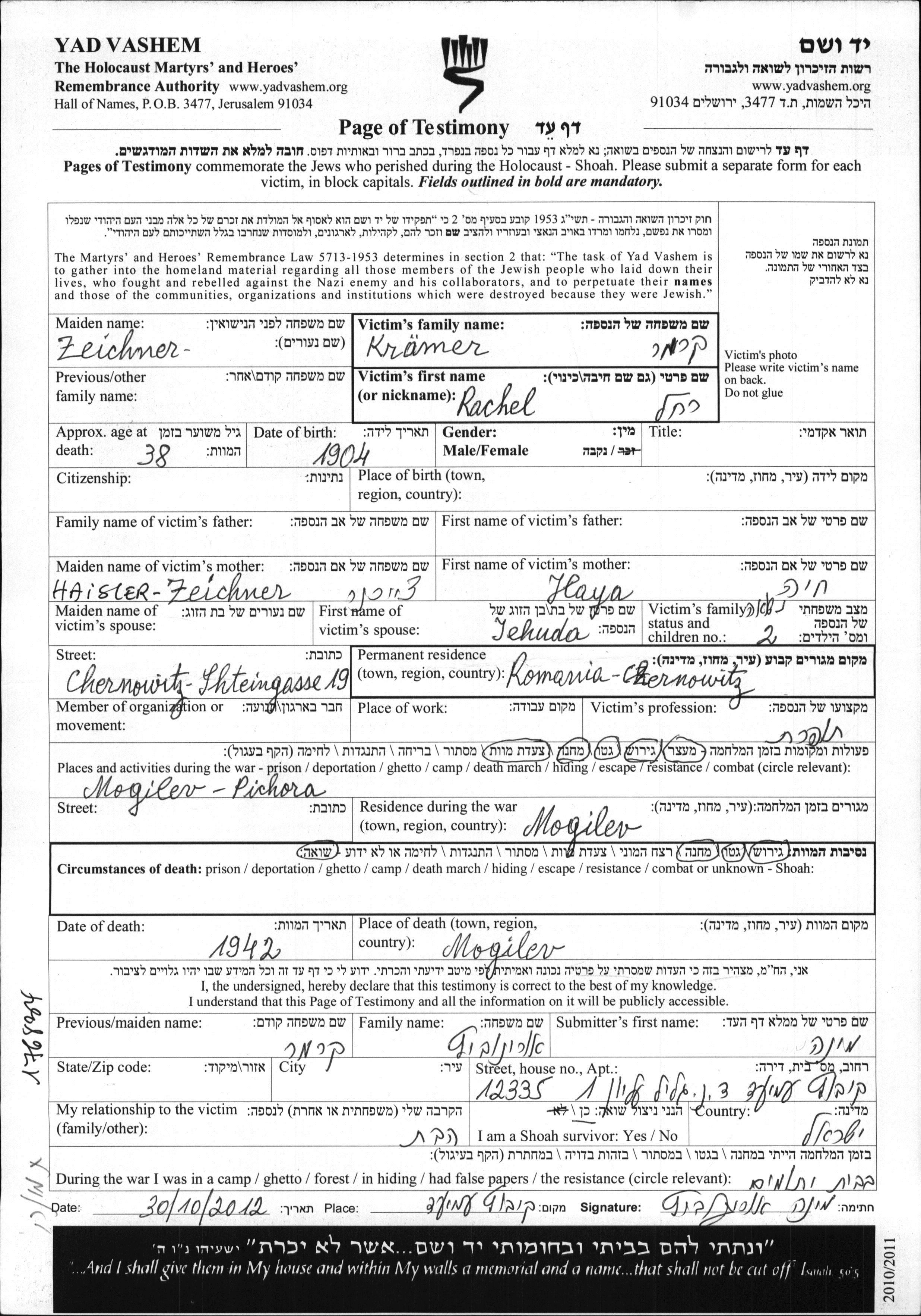Rachel Kraemer nee Zeichner was born in Vaskovic, Romania, 1904. She was a seamstress. Prior to WWII she lived in Chernowitz, Romania. Rachel was murdered in the Shoah. Place of death: unknown, 1942.