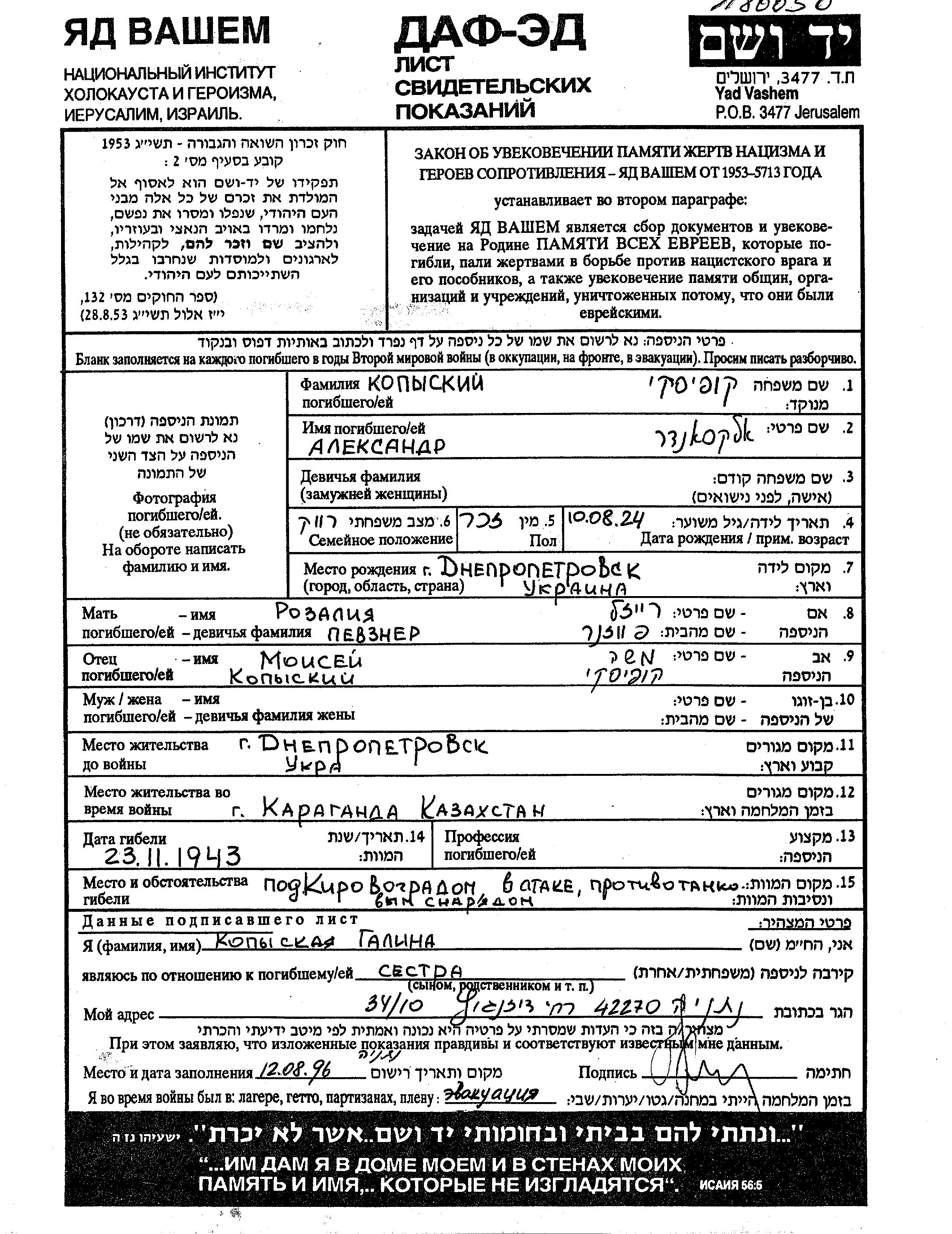 Kopyski Aleksandr 1922 Dnepropetrovsk, Ukraine (USSR) Page of Testimony