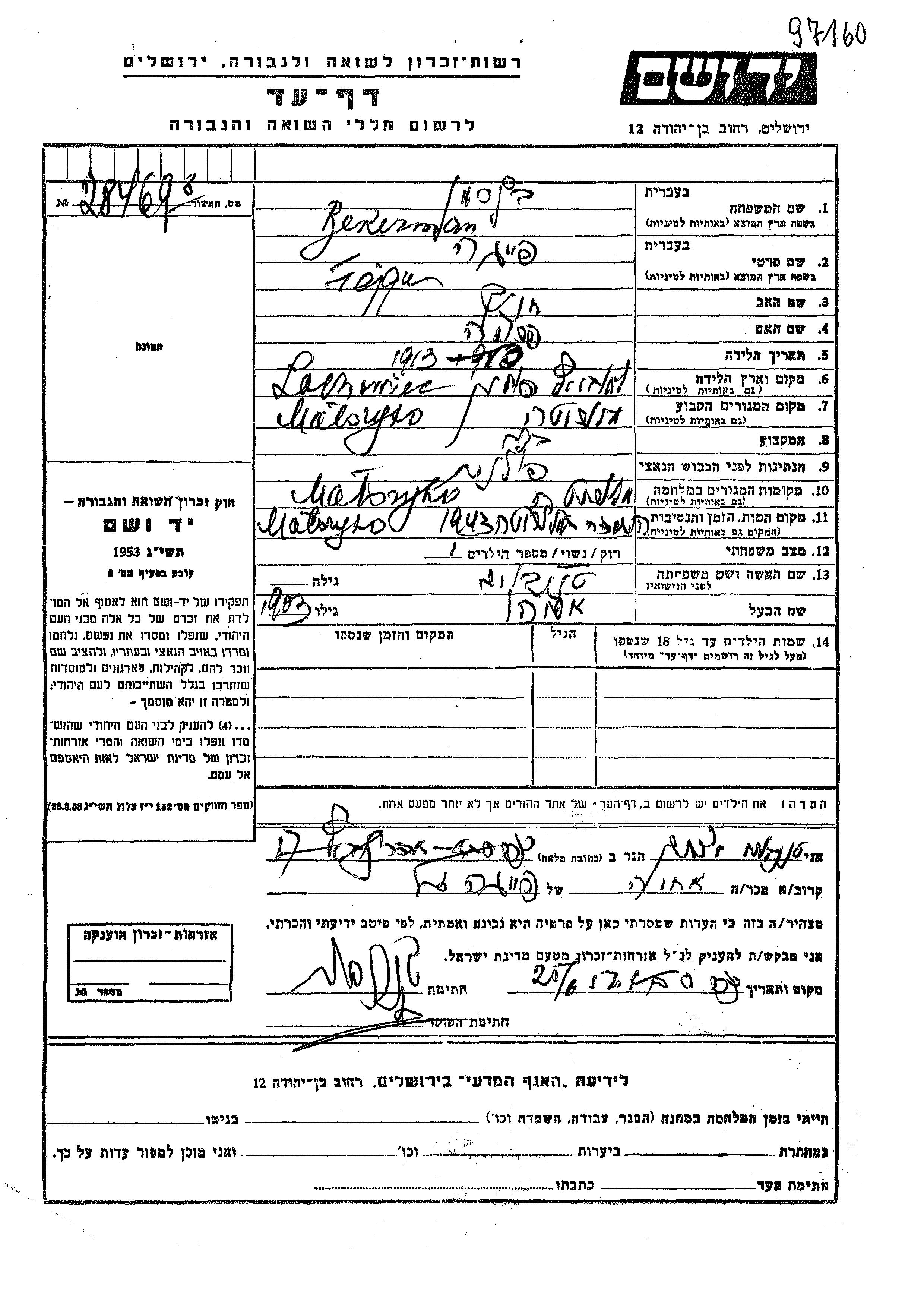 Fejga Bekerman nee Tenenboim was born in Lachowce, Poland, 1913 to Khanokh and Fruda. She was married to Eliahu. Prior to WWII she lived in Maloryta, Poland. During the war she was in Malorita, Poland. Fejga was murdered in the Shoah. Place of death: Maloryta, Poland, 1943.